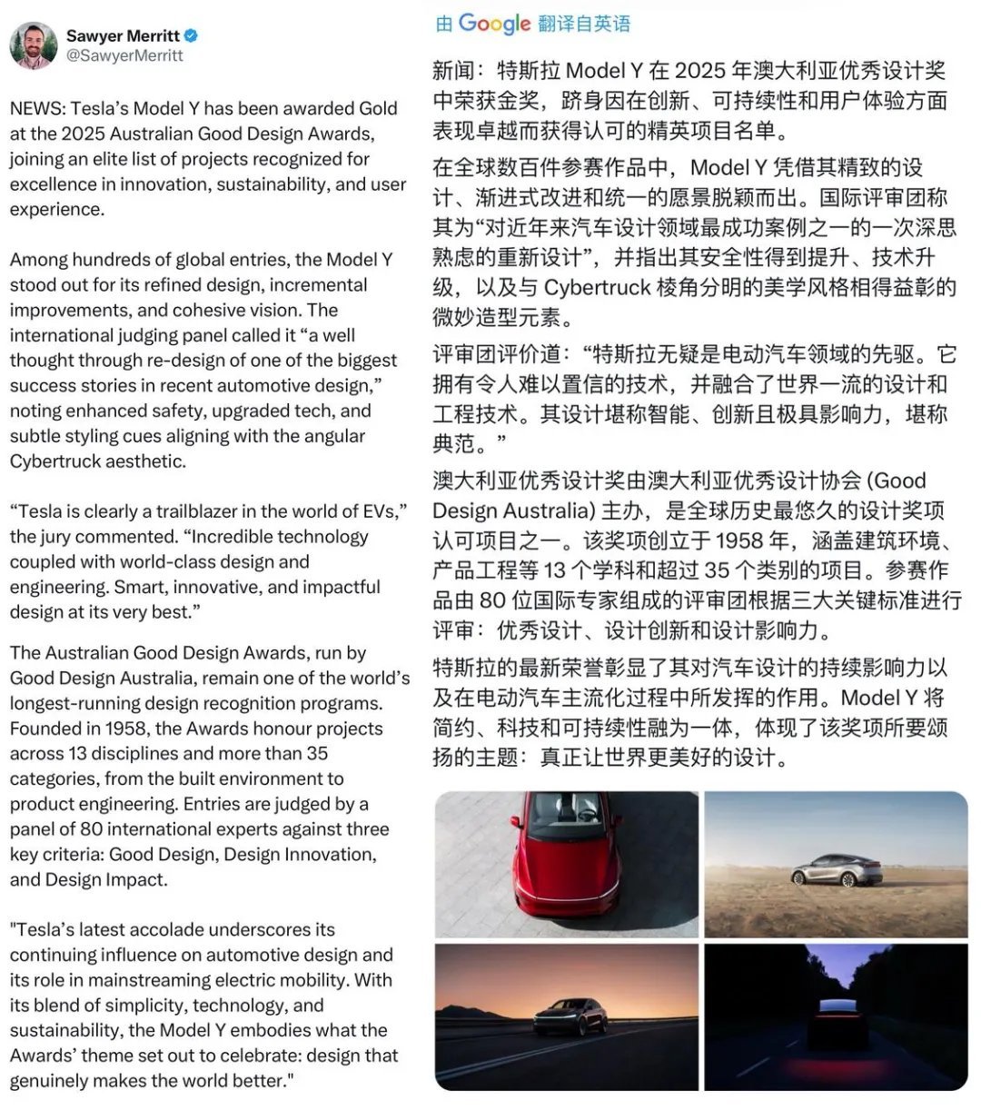 特斯拉官方在海外社交平台分享了一则好消息:Model Y与Powerwall 3双双荣获2025年澳大利亚优秀设计奖(2025 Australian Good Design Awards)的设计与创新奖。