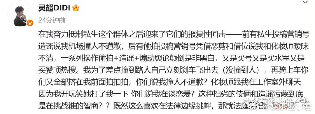 灵超称被私生报复回击灵超发文回应称:“在我奋力抵制私生这个个体之后迎来了它们的报复性回击”,他称私生造谣自己机场撞人不道歉,还恶剪自己和化妆师暧昧不清,“既然这么喜欢在法律边缘挑衅,那就法庭见吧。
