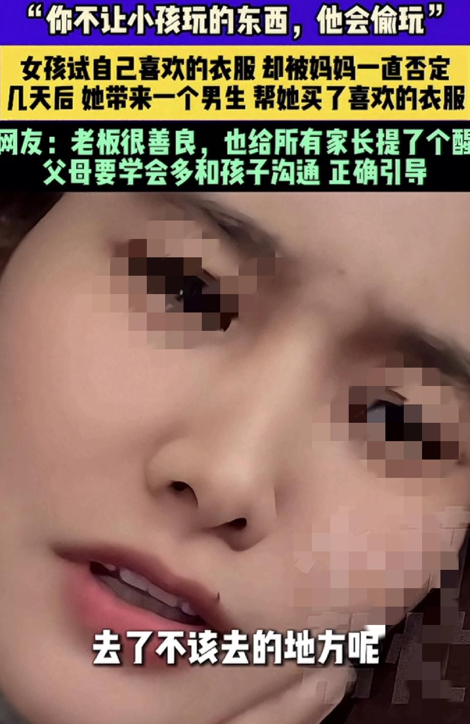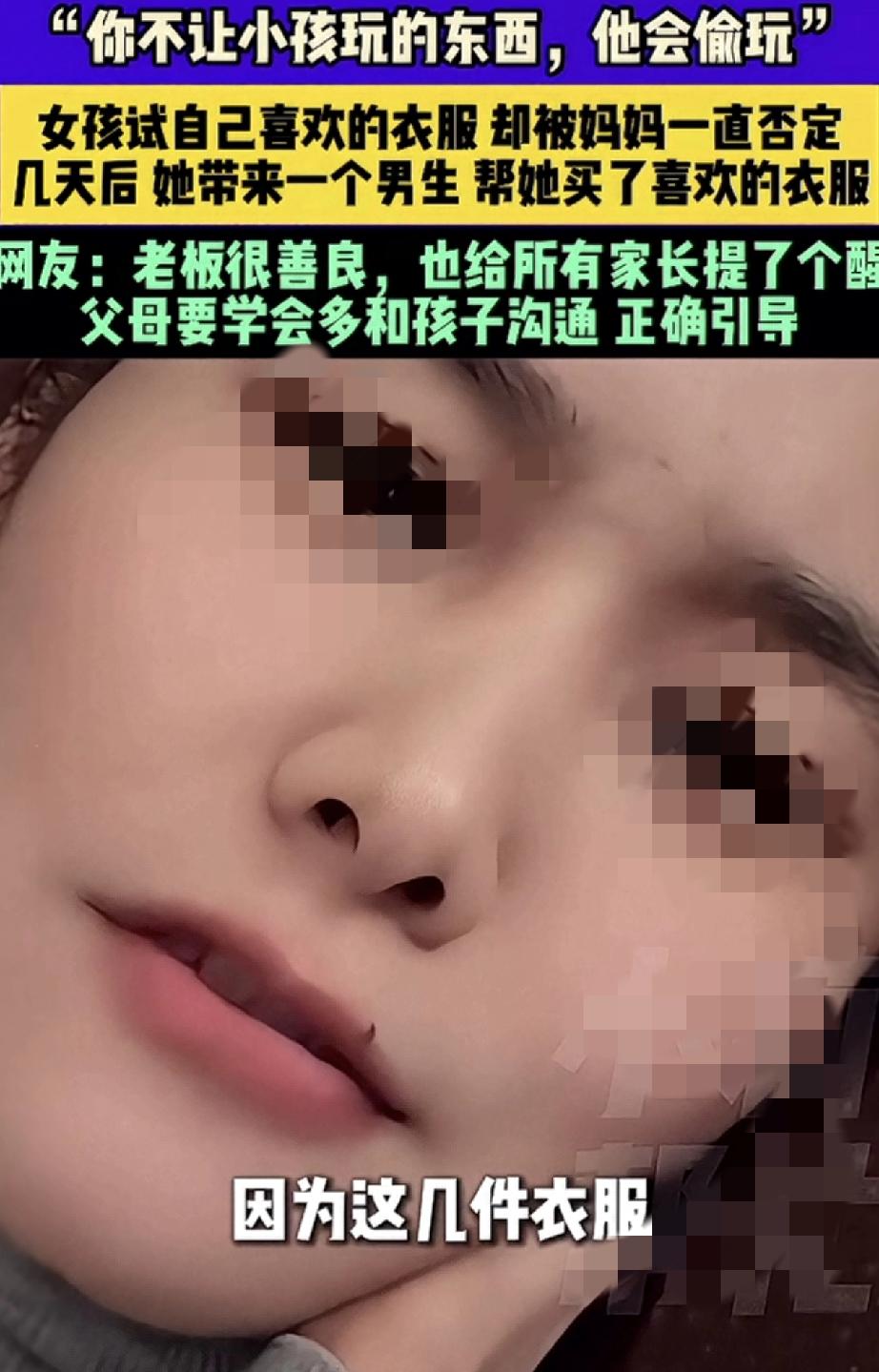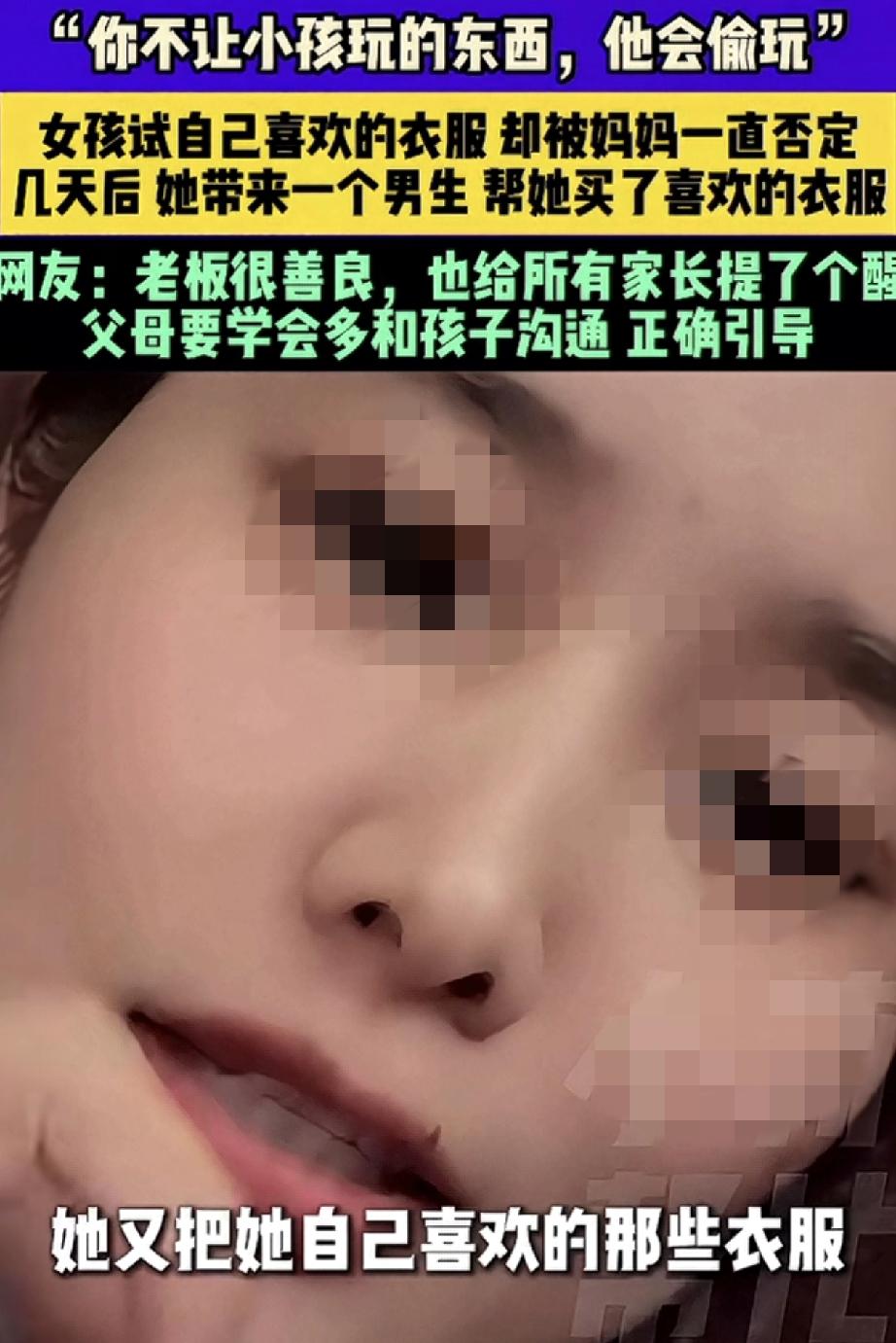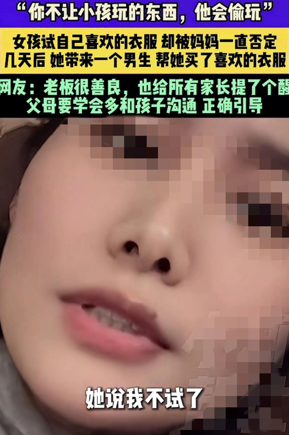 “你不让小孩玩的东西,他会偷玩。你不让孩子买的衣服,他会找别人帮他买”。安徽,一服装店老板娘在网上分享,这天她在店内接待了一对母女,期间十多岁的女孩在妈妈的陪同下试衣服,可女孩每试一件衣服,她妈妈都觉得不好看,并各种否定和挑毛病,最终试了半个小时衣服的女孩无奈的坐在沙发上表示,不买了。 不过,女孩妈妈虽然没给女孩买她喜欢的那件衣服,但还是给女孩挑了一件更贵,妈妈觉得更好看的衣服,可女孩却表示不喜欢,于是当天女孩便没有买任何一件衣服就走了。 而几天后,女孩却和一名男生骑着共享电动车再次来到店铺,这次在男生的陪同下,女孩在试她喜欢的那些衣服时,男生不但对其一阵夸赞,最后还帮女孩买了一套她喜欢的衣服,当时女孩买到自己想要的衣服后,便特别高兴的和男生一起离开了。 可老板娘这边虽然做成一单生意,但却一点也高兴不起来,反倒是越想越不对劲,她担心女孩会不会因为一件衣服,被男生带到不该去的地方,于是老板娘几次的用手机联系女孩,直到确认女孩回家后,才放下了悬着的心。 而老板娘分享此事,就是想提醒各位家长,父母要学会多和孩子沟通,不能一味的让孩子啥都听家长的,家长也应该好好听听他的想法。不然,他们总会想办法得到他想要的东西! 回想一下,孩子的审美可能和家长不在一个频道上,但只要不伤风败俗,做家长的也应该学会尊重孩子的想法。毕竟每个孩子审美都是阶段性的,而孩子大了,如果他不愿父母跟着买东西,就让他自己去决定和购买,有时给孩子一些自由空间,又何尝不是对他们的一种理解和尊重呢? 买东西如此,生活中与孩子相处也应该如此,做家长的一定要尊重和理解孩子的想法,并正确引导他们。不然一味地否定孩子,只会将孩子推离你的身边!