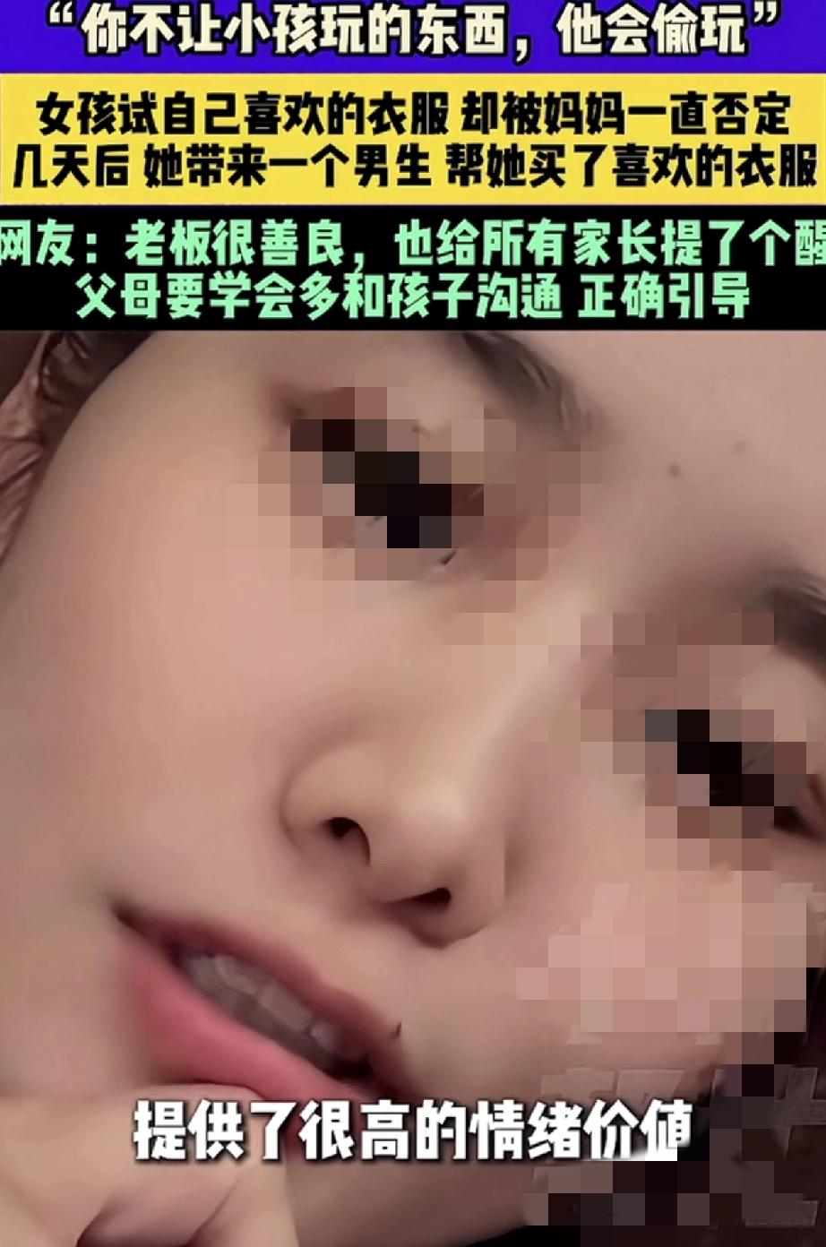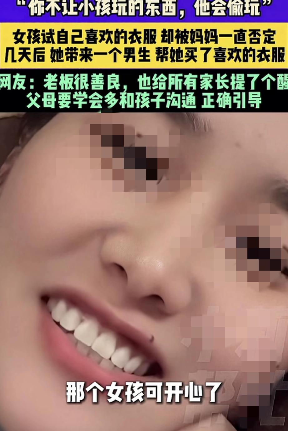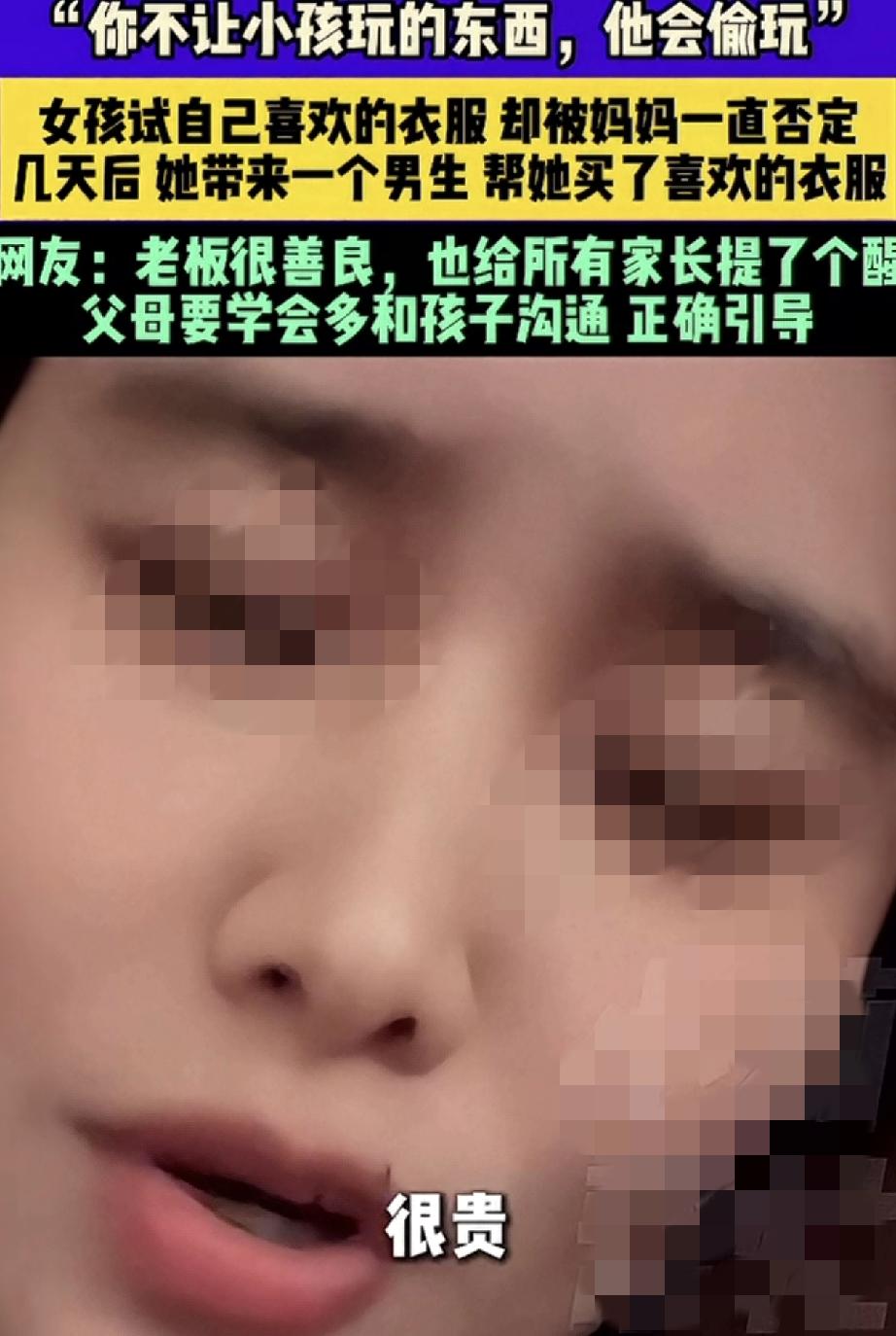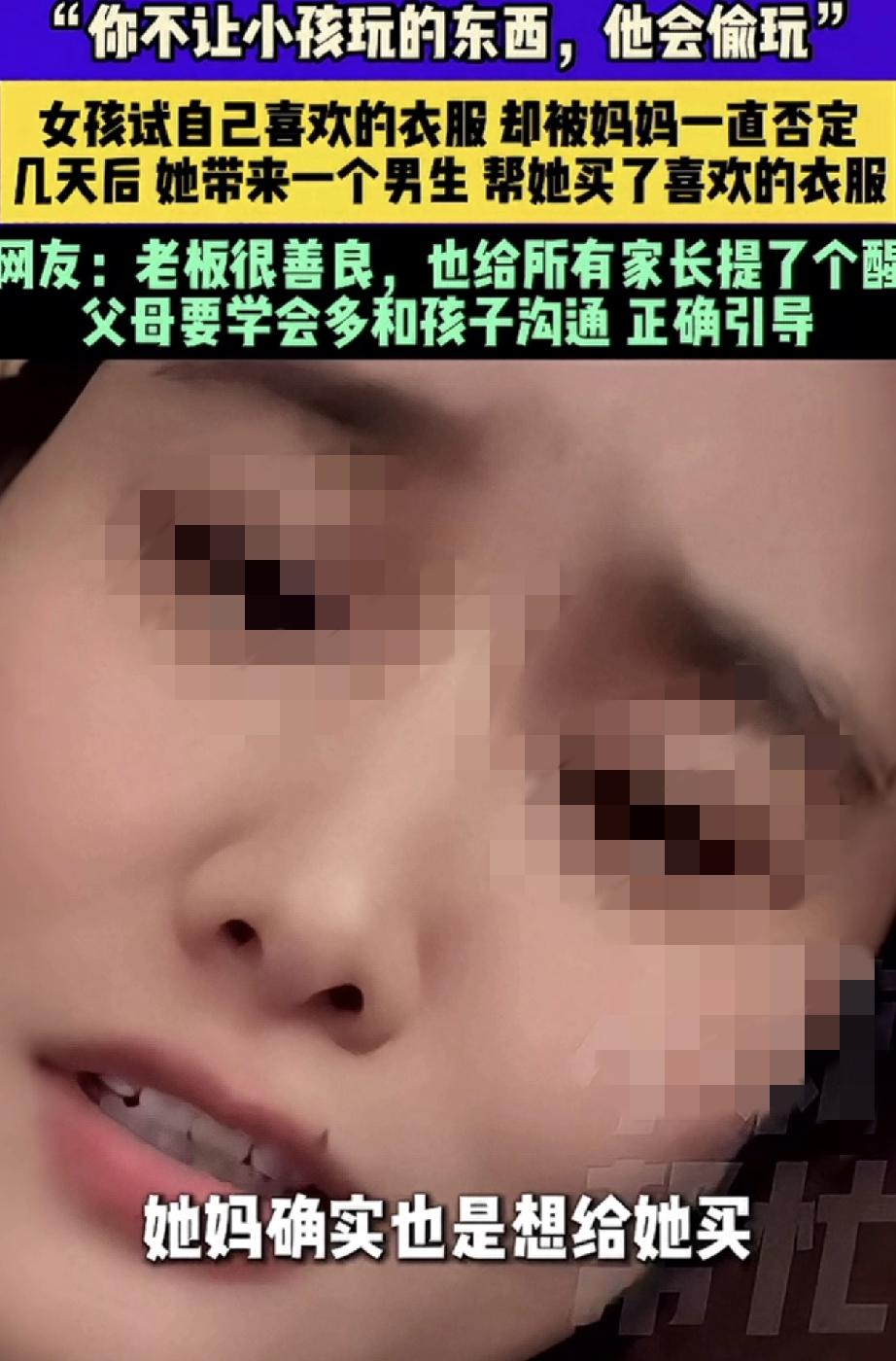 “你不让小孩玩的东西,他会偷玩。你不让孩子买的衣服,他会找别人帮他买”。安徽,一服装店老板娘在网上分享,这天她在店内接待了一对母女,期间十多岁的女孩在妈妈的陪同下试衣服,可女孩每试一件衣服,她妈妈都觉得不好看,并各种否定和挑毛病,最终试了半个小时衣服的女孩无奈的坐在沙发上表示,不买了。 不过,女孩妈妈虽然没给女孩买她喜欢的那件衣服,但还是给女孩挑了一件更贵,妈妈觉得更好看的衣服,可女孩却表示不喜欢,于是当天女孩便没有买任何一件衣服就走了。 而几天后,女孩却和一名男生骑着共享电动车再次来到店铺,这次在男生的陪同下,女孩在试她喜欢的那些衣服时,男生不但对其一阵夸赞,最后还帮女孩买了一套她喜欢的衣服,当时女孩买到自己想要的衣服后,便特别高兴的和男生一起离开了。 可老板娘这边虽然做成一单生意,但却一点也高兴不起来,反倒是越想越不对劲,她担心女孩会不会因为一件衣服,被男生带到不该去的地方,于是老板娘几次的用手机联系女孩,直到确认女孩回家后,才放下了悬着的心。 而老板娘分享此事,就是想提醒各位家长,父母要学会多和孩子沟通,不能一味的让孩子啥都听家长的,家长也应该好好听听他的想法。不然,他们总会想办法得到他想要的东西! 回想一下,孩子的审美可能和家长不在一个频道上,但只要不伤风败俗,做家长的也应该学会尊重孩子的想法。毕竟每个孩子审美都是阶段性的,而孩子大了,如果他不愿父母跟着买东西,就让他自己去决定和购买,有时给孩子一些自由空间,又何尝不是对他们的一种理解和尊重呢? 买东西如此,生活中与孩子相处也应该如此,做家长的一定要尊重和理解孩子的想法,并正确引导他们。不然一味地否定孩子,只会将孩子推离你的身边!