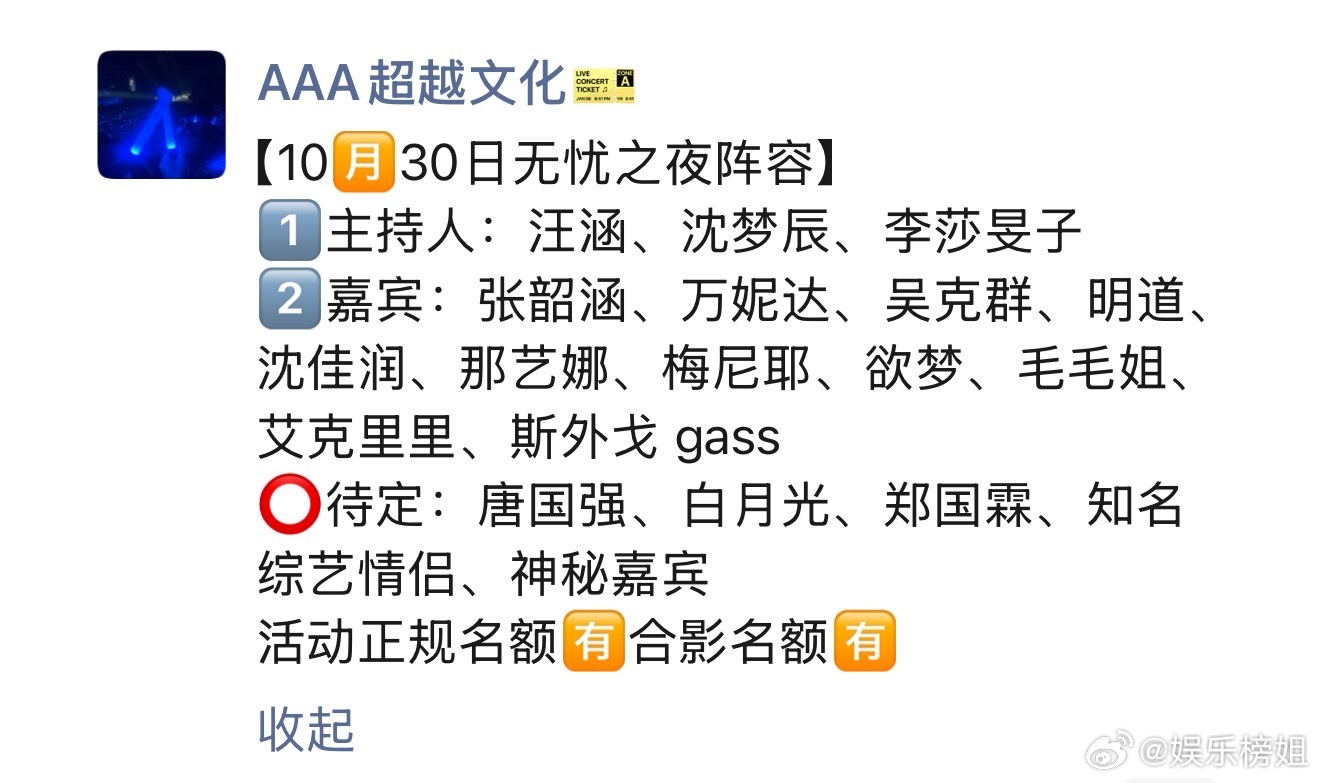 网传无忧之夜2025阵容🍉wyzy阵容来了,目前看到有汪涵、沈梦辰、李莎昱子