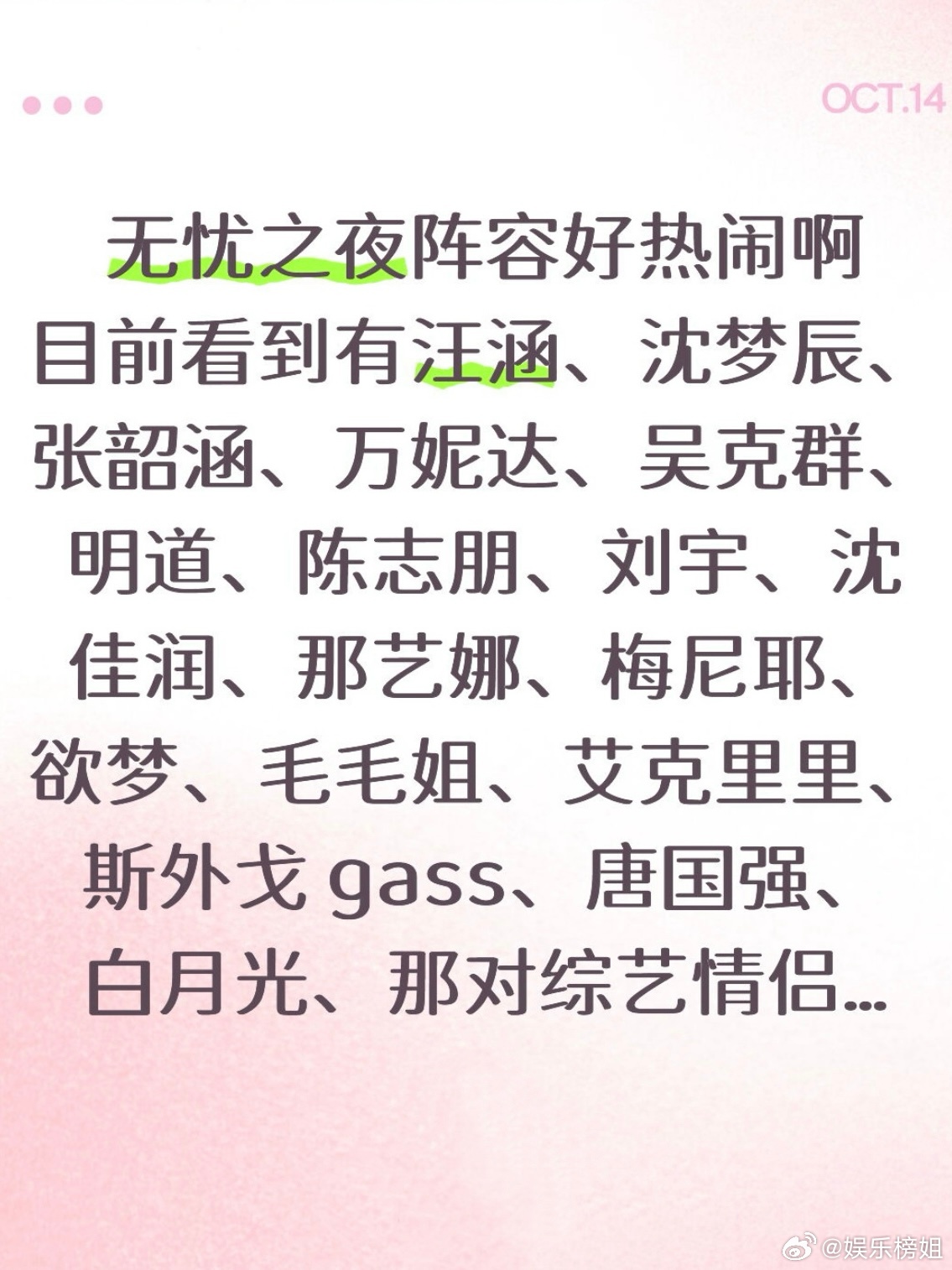 网传无忧之夜2025阵容 🍉wyzy阵容来了,目前看到有汪涵、沈梦辰、李莎昱子、张韶涵、万妮达吴克群、明道、沈佳润、那艺娜、梅尼耶、欲梦、毛毛姐、艾克里里、斯外戈 gass、唐国强、白月光、郑国霖、知名综艺情侣... 瞳孔一震又一震,好多人呐!好期待真正官宣时候的番位🤔 爆汪涵沈梦辰主持红人盛典