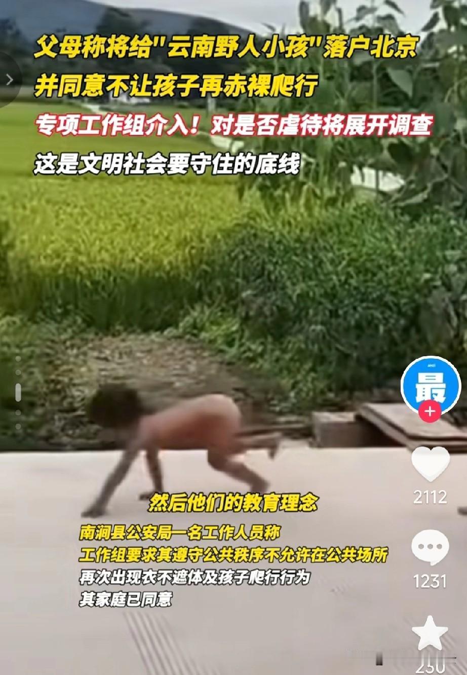 大家关心的野人小孩后续来了,经过网友们的努力,官方重新调查。现在官方说了,野人小孩终于不用在外面漂泊了,他跟着爸爸妈妈要回北京生活了。 工作组的工作人员说,他们联系到了小孩在北京居住的姥姥,姥姥愿意接纳女儿一家,帮着孩子在北京落户。 孩子的父母也终于改口,说会去北京生活,现在他们已经往北京赶了。两个孩子以后再也不用过衣不蔽体的生活了。 希望孩子父母没有撒谎,让两个孩子回归到正常的生活。两个孩子还小,应该还有机会把生活习惯改过来,如果大了,真的就不好改了。 对于这件事,你怎么看呢?