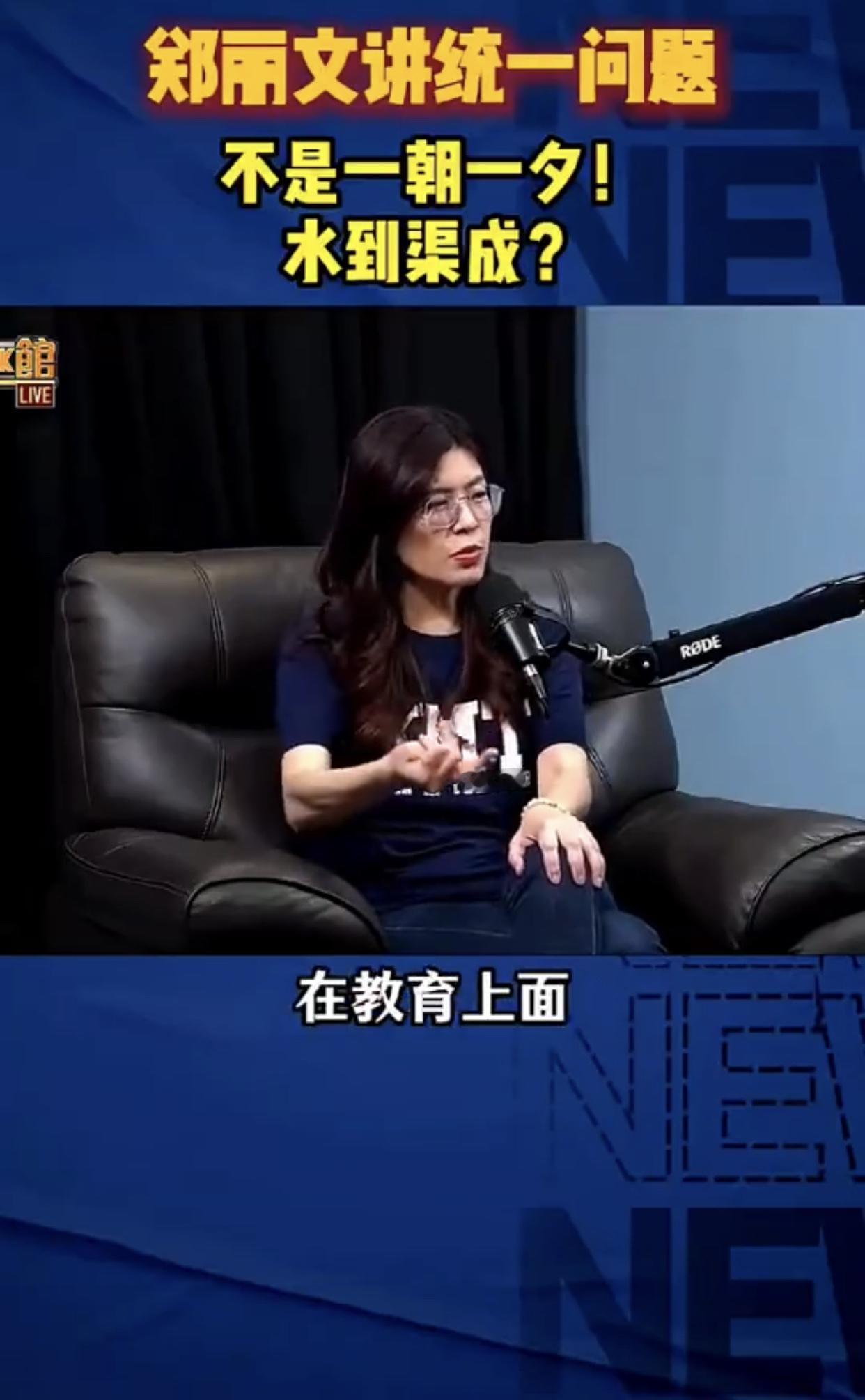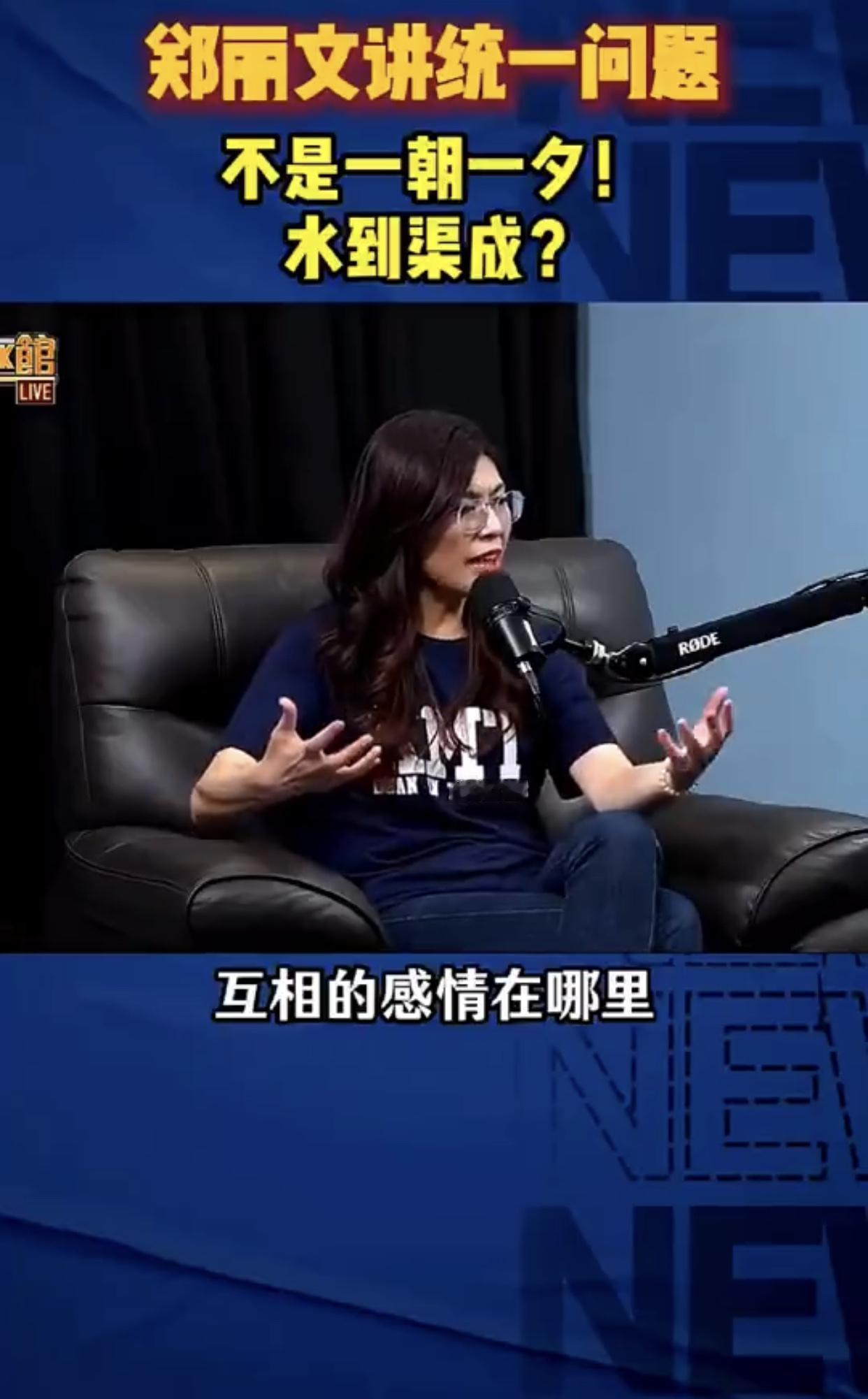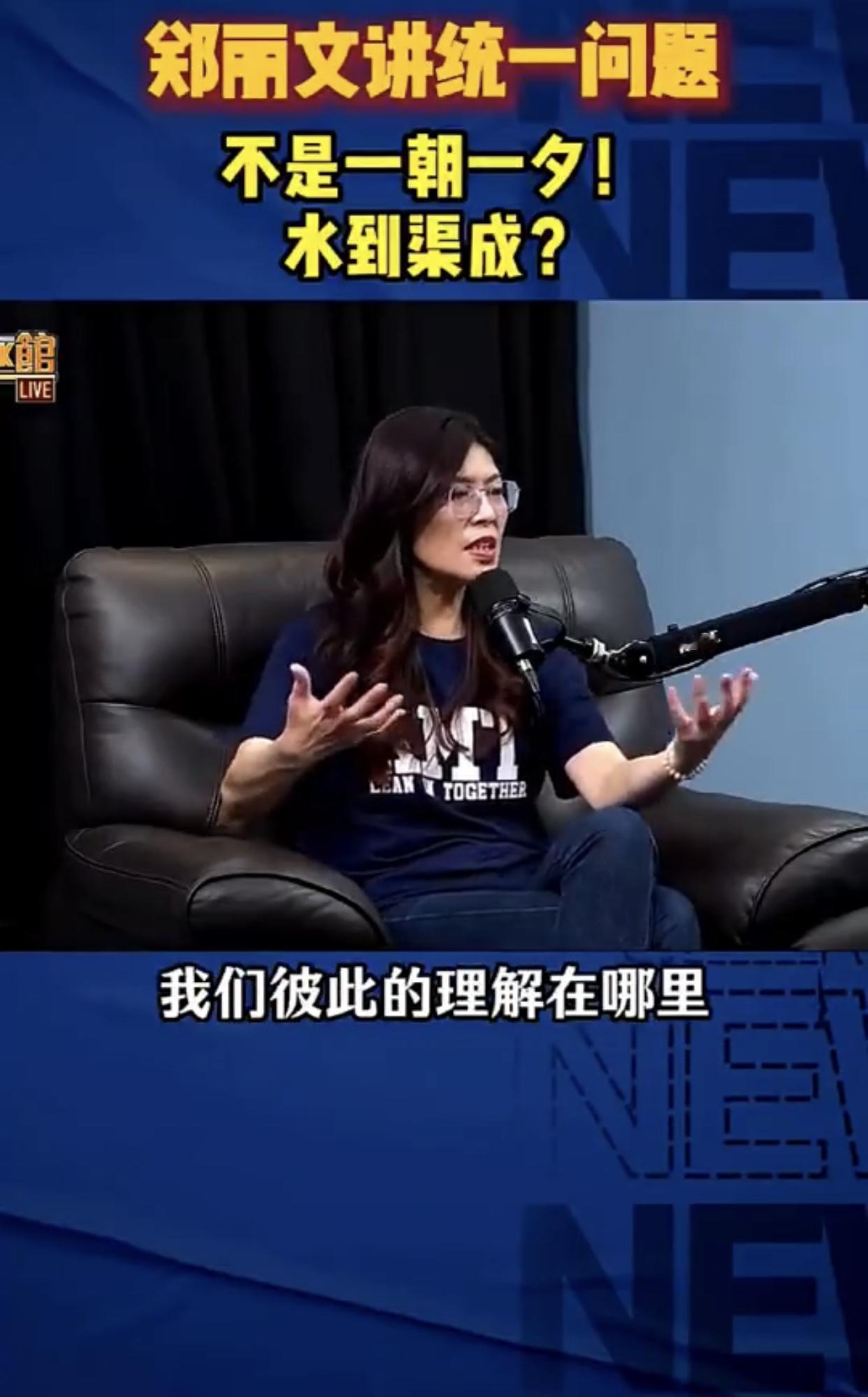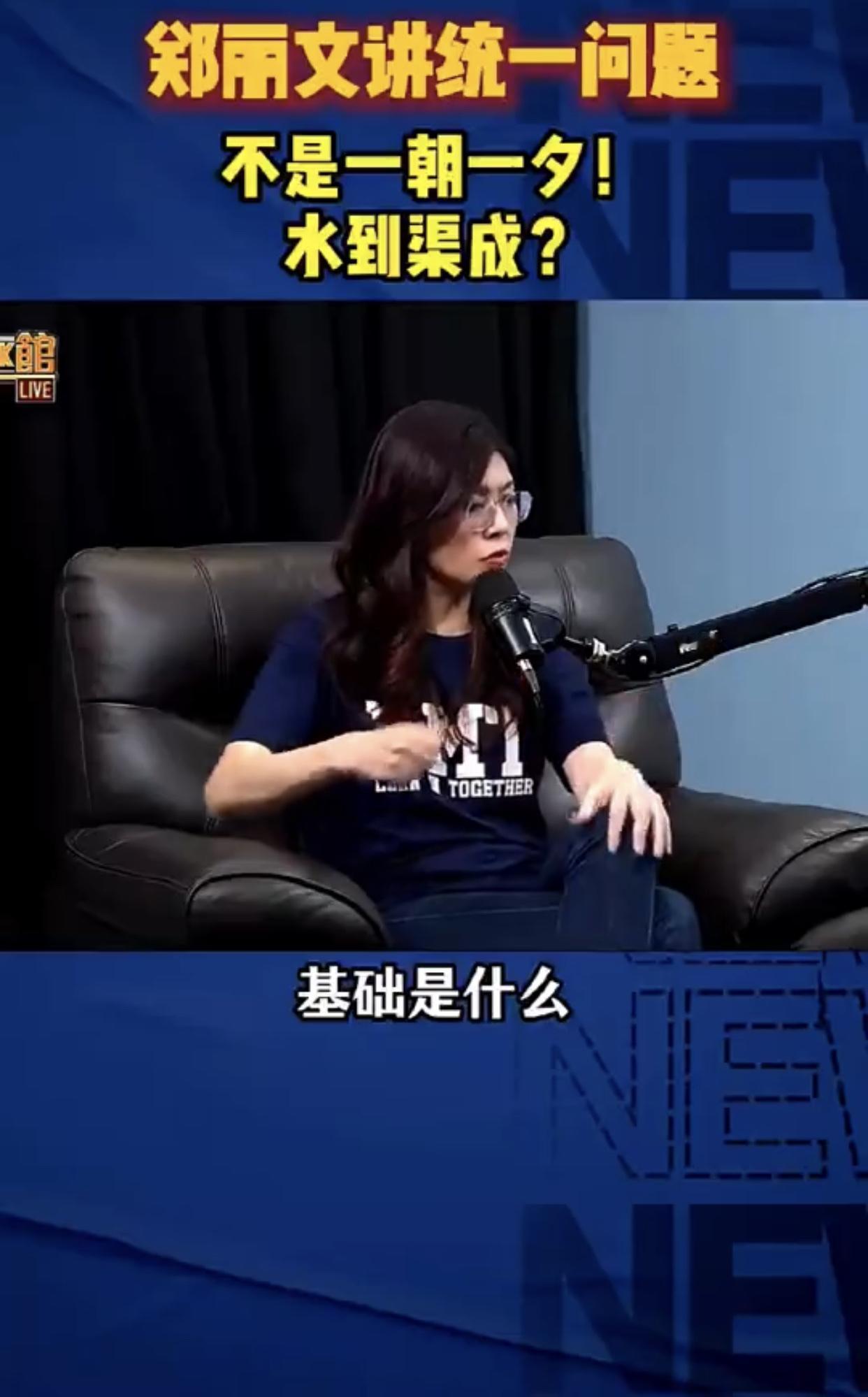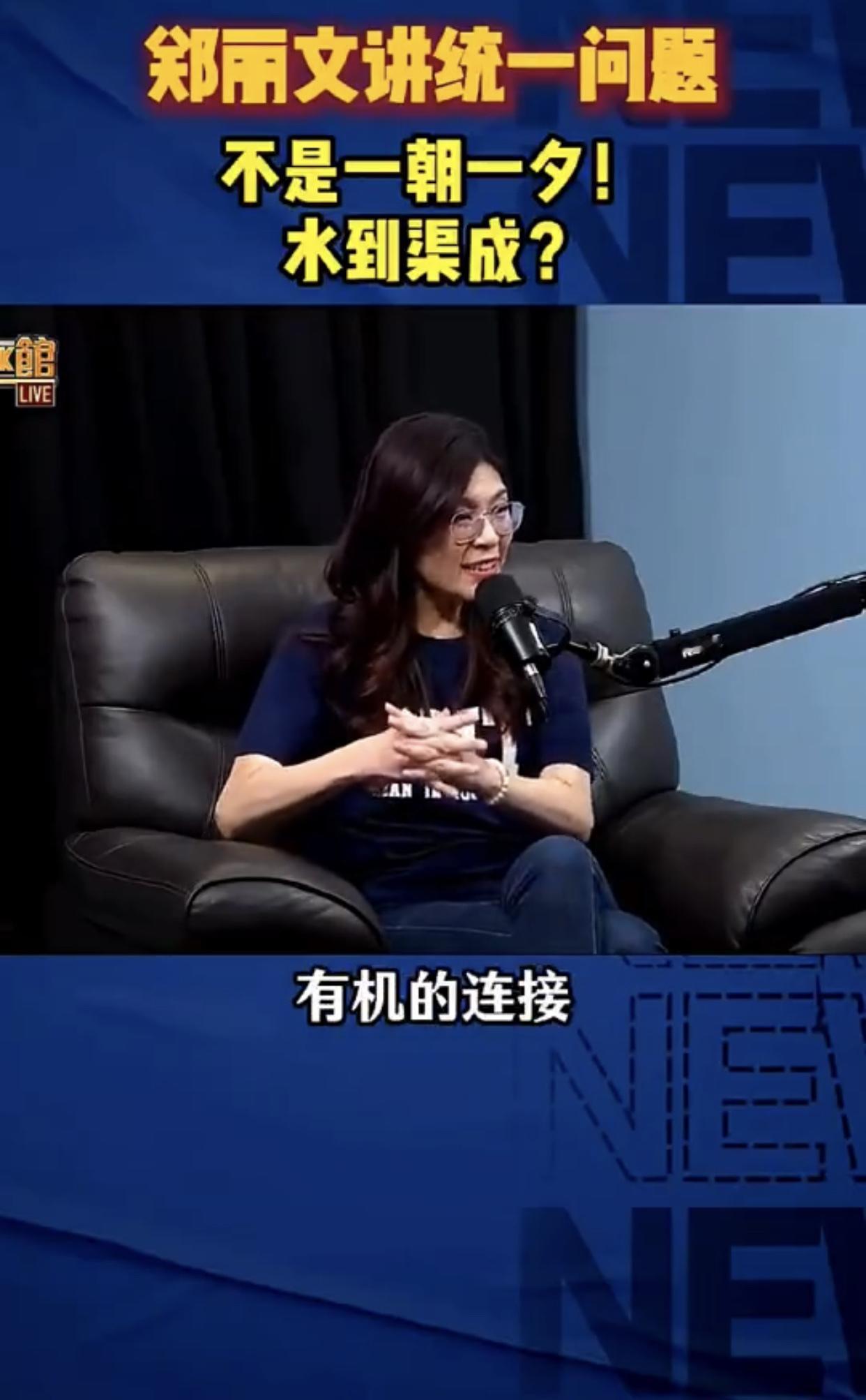 台湾国民党郑丽文在接受馆长专访,谈及两岸统一问题时表示:“统一的问题就在于说,现在两边要和不是一朝一夕,的确也不是一个统一两个字这么简单, 这中间多少复杂的情绪,互信在哪里?互相的感情在哪里?我们彼此的理解在哪里?交往是什么?基础是什么?什么叫做百年基业?就是在经济上面,在基础建设上面,在教育上面,方方面面,有机的连接,然后让台湾百姓尝到说,哦,原来两岸和解和平合作,能让我们看到更美好的未来。”
