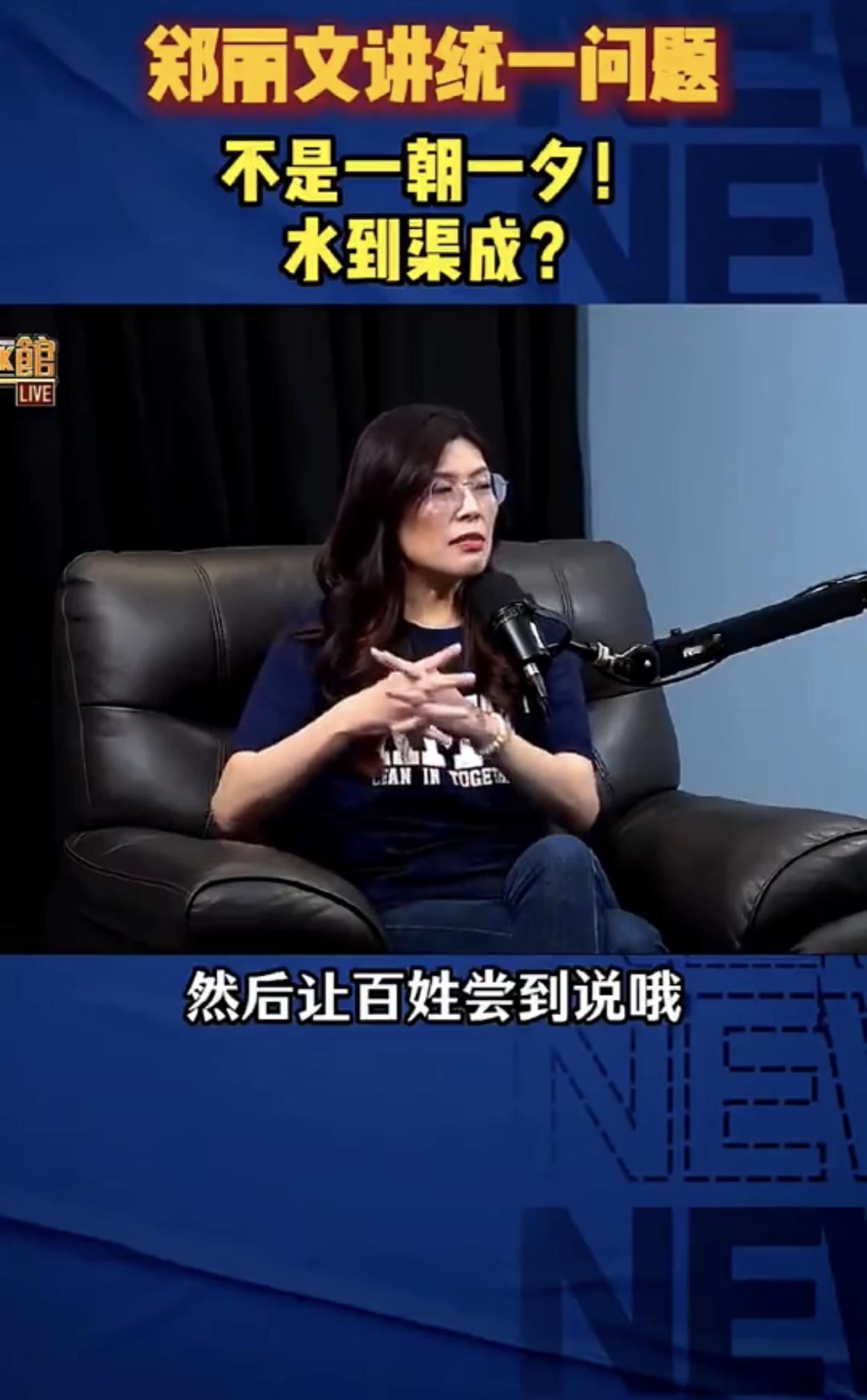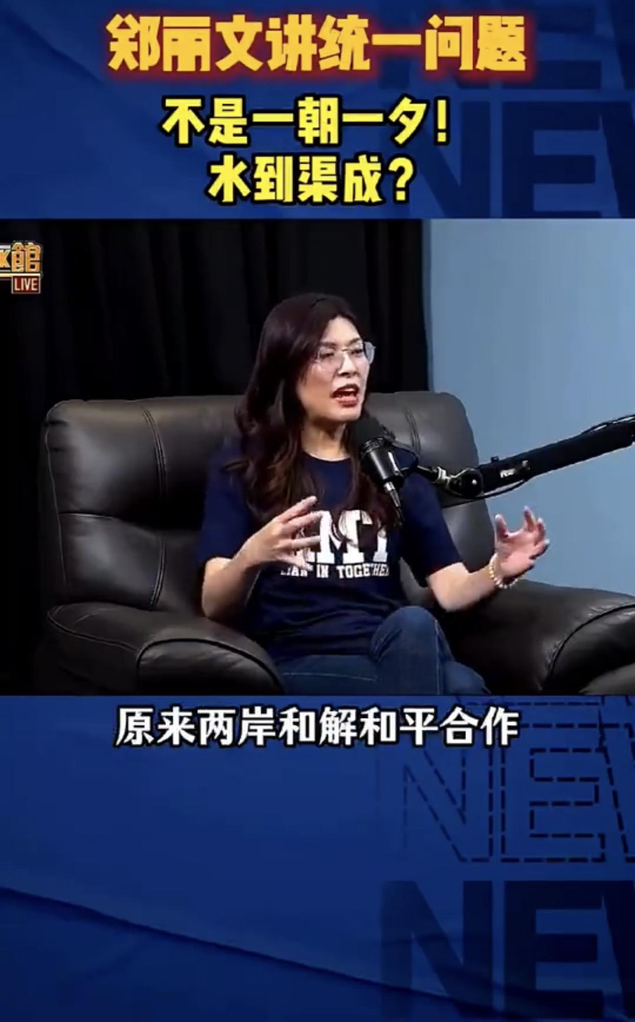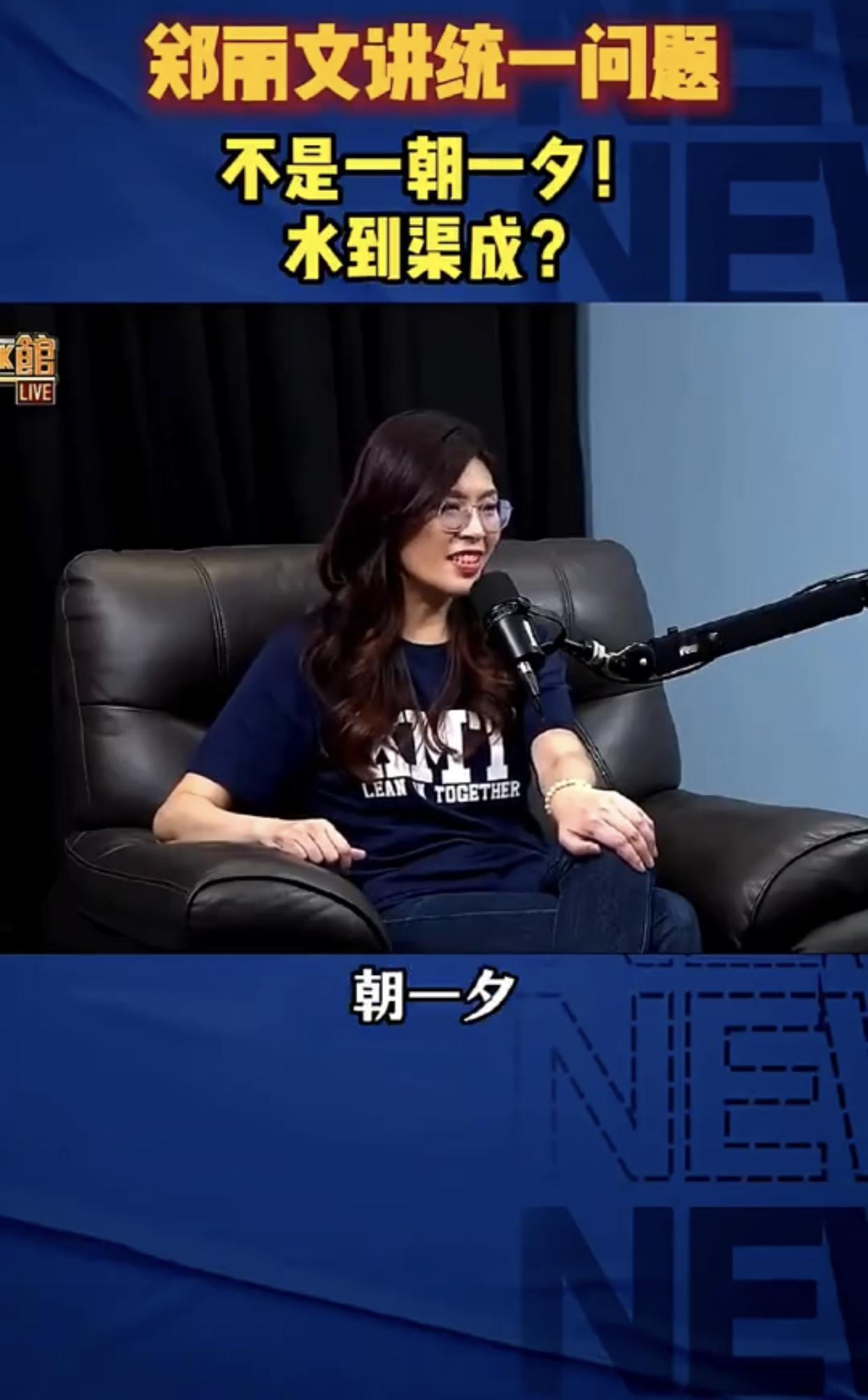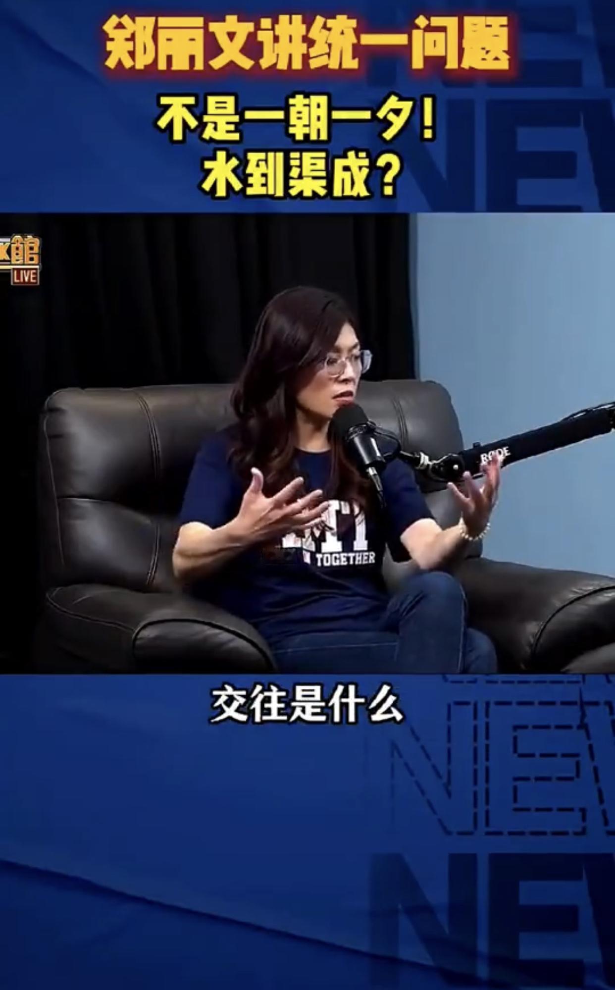 台湾国民党郑丽文在接受馆长专访,谈及两岸统一问题时表示:“统一的问题就在于说,现在两边要和不是一朝一夕,的确也不是一个统一两个字这么简单, 这中间多少复杂的情绪,互信在哪里?互相的感情在哪里?我们彼此的理解在哪里?交往是什么?基础是什么?什么叫做百年基业?就是在经济上面,在基础建设上面,在教育上面,方方面面,有机的连接,然后让台湾百姓尝到说,哦,原来两岸和解和平合作,能让我们看到更美好的未来。”