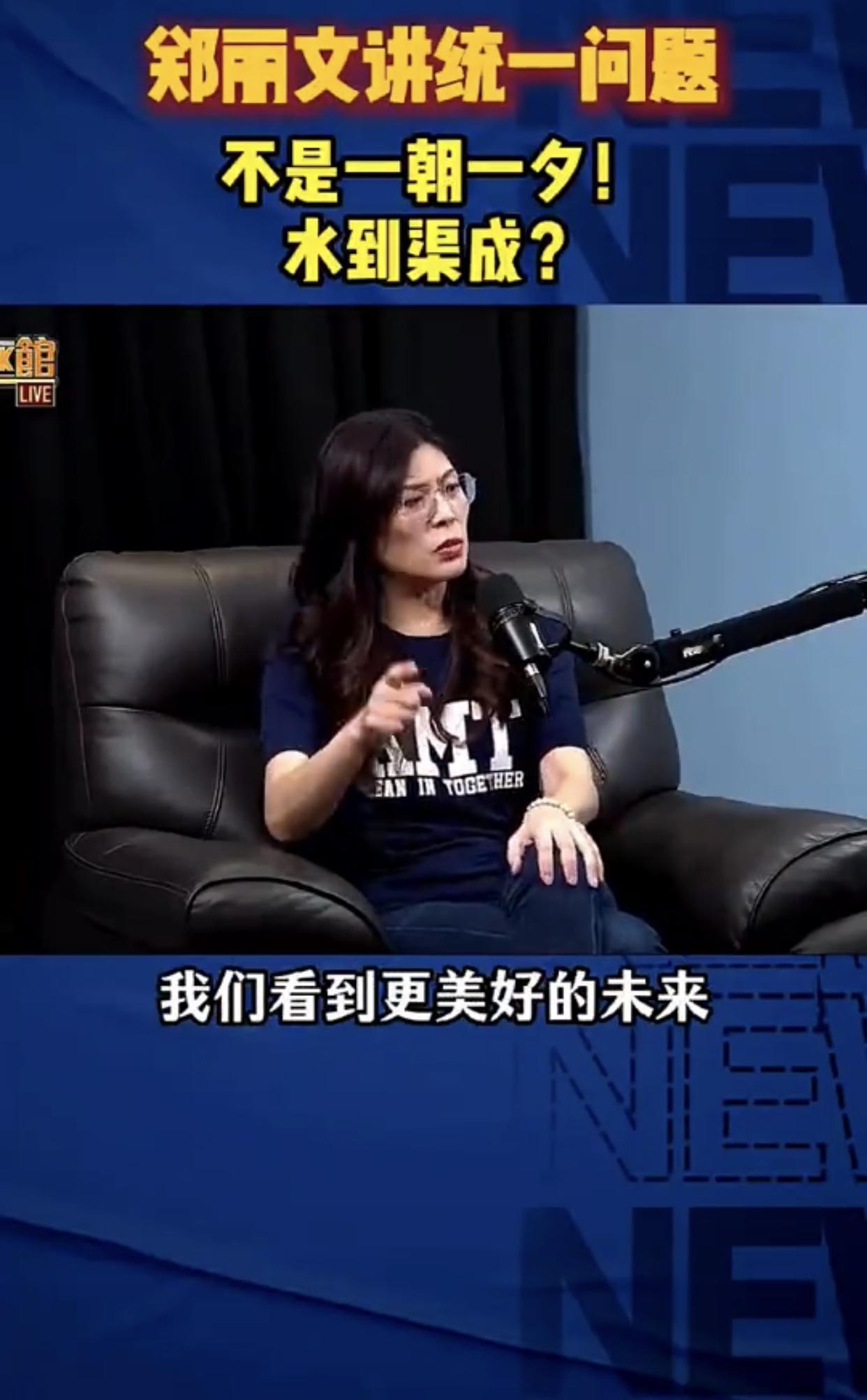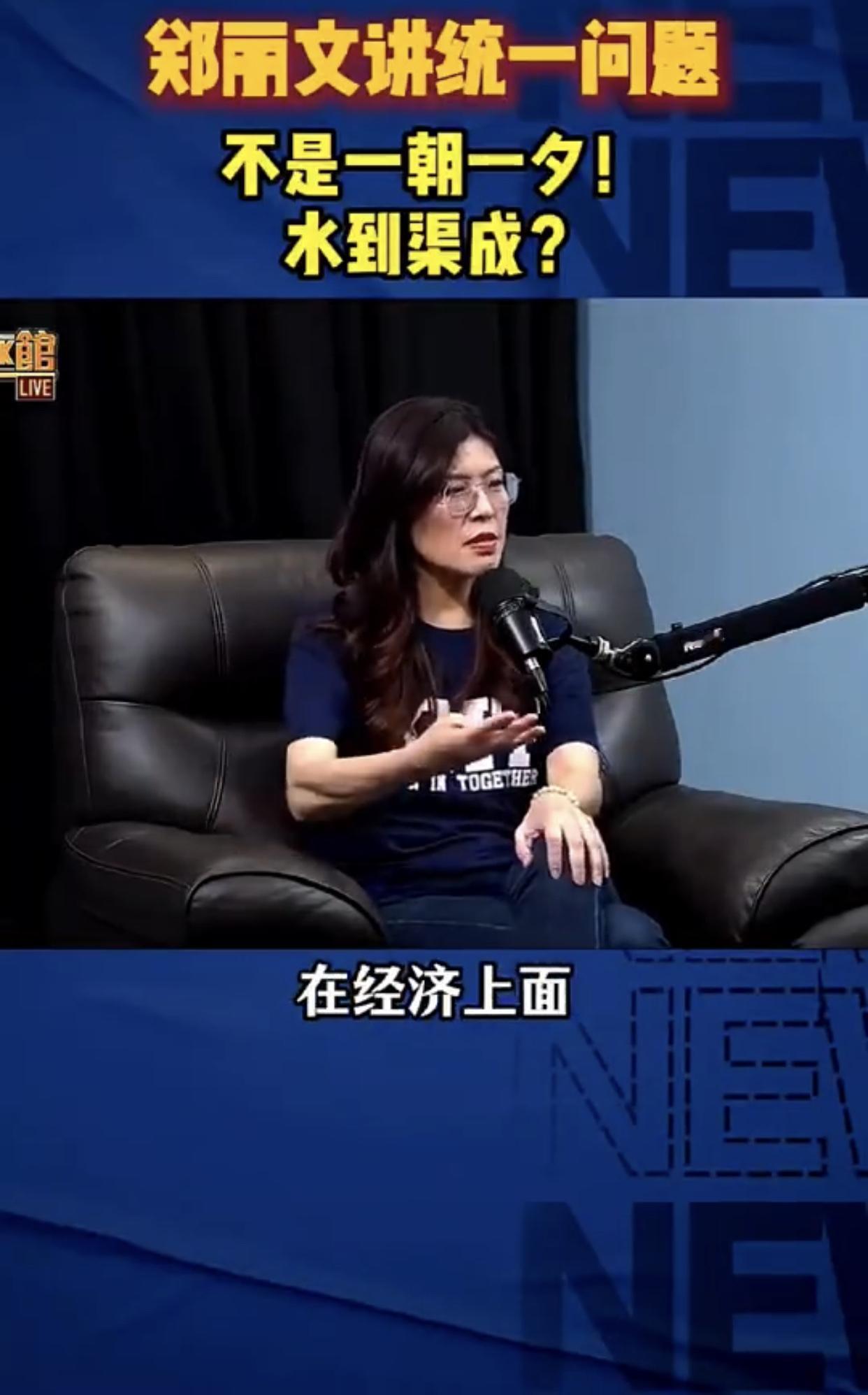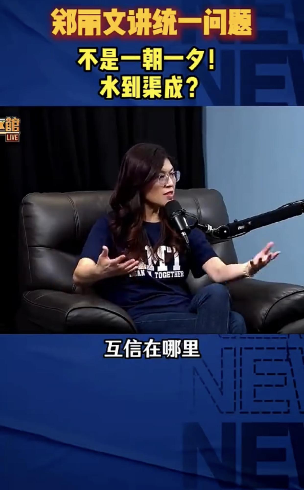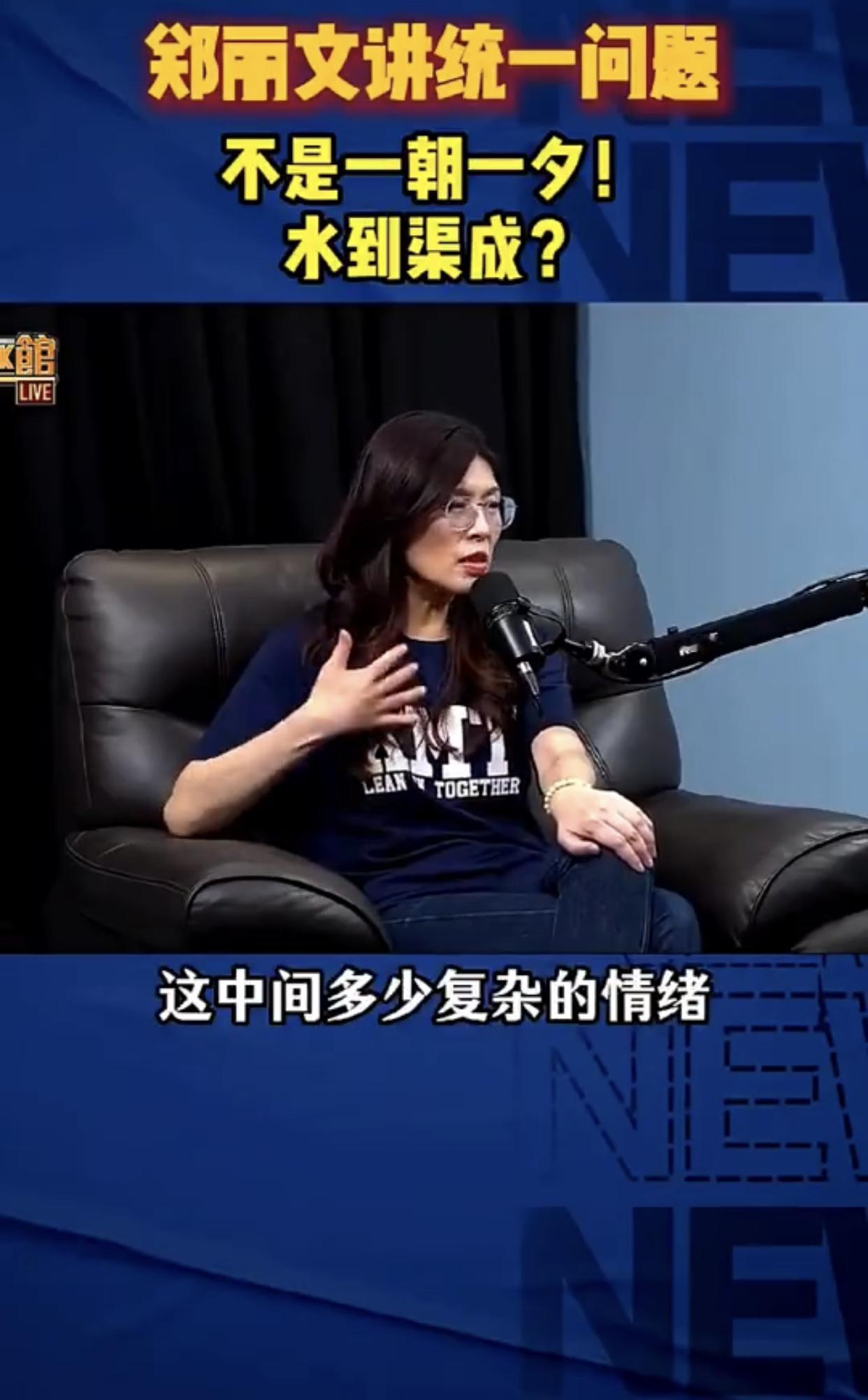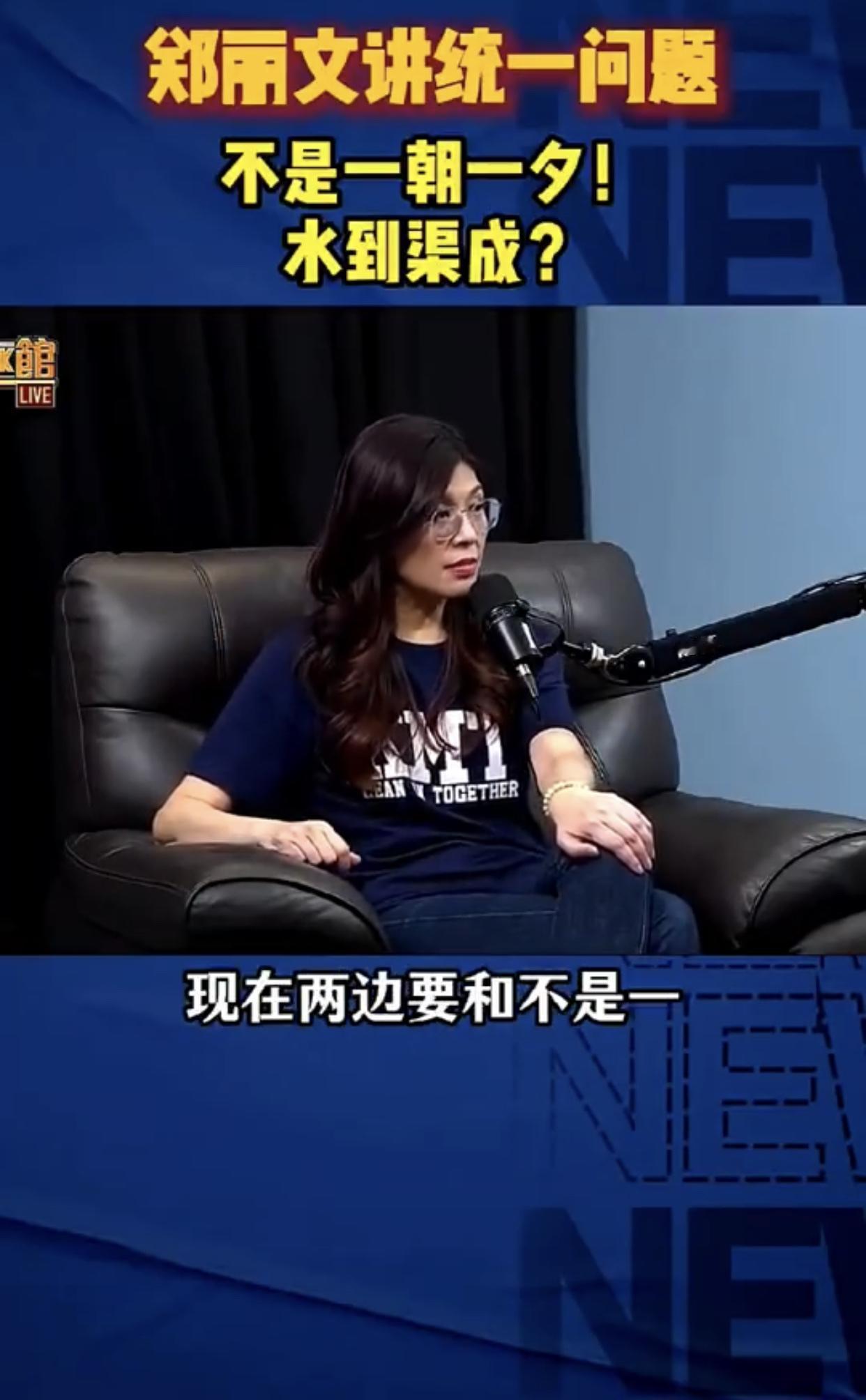 台湾国民党郑丽文在接受馆长专访,谈及两岸统一问题时表示:“统一的问题就在于说,现在两边要和不是一朝一夕,的确也不是一个统一两个字这么简单, 这中间多少复杂的情绪,互信在哪里?互相的感情在哪里?我们彼此的理解在哪里?交往是什么?基础是什么?什么叫做百年基业?就是在经济上面,在基础建设上面,在教育上面,方方面面,有机的连接,然后让台湾百姓尝到说,哦,原来两岸和解和平合作,能让我们看到更美好的未来。”