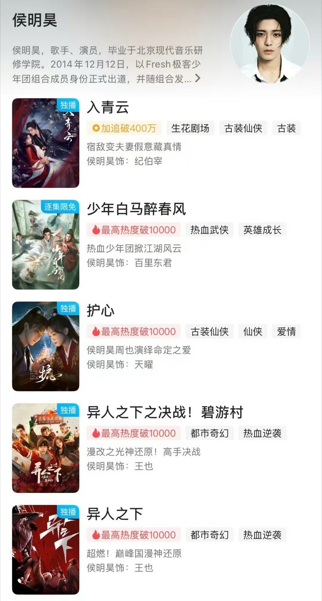 侯明昊优酷3部一番破万剧恭喜侯明昊达成优酷三部一番剧全部破万!不同风格的角色都