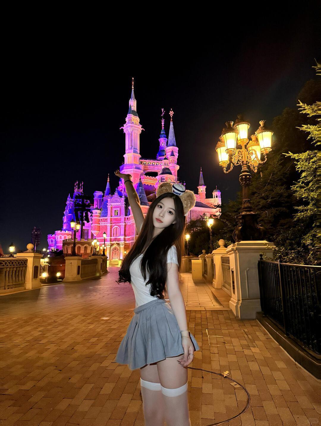 白体恤搭配百褶裙,夜晚的浪漫时光🌟✨夜景气质少女 穿搭 城堡梦幻之姿 童话城堡夜景 性感
