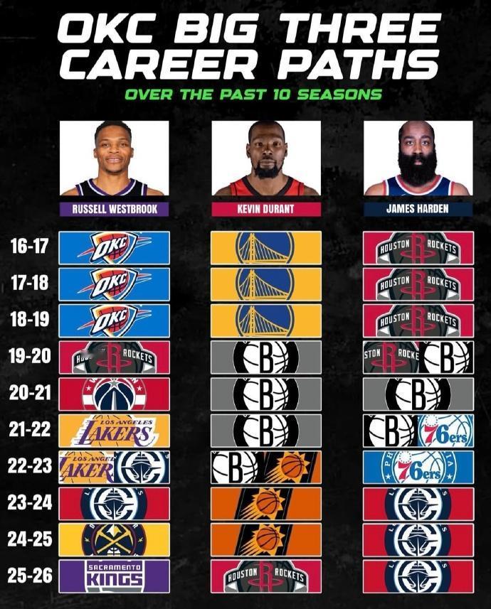 雷霆三少过去10个赛季球队变化: 威少:雷霆、火箭、奇才、湖人、快船、掘金、国王 杜兰特:勇士、篮网、太阳、火箭 哈登:火箭、篮网、76人、快船 三个人的共同点是都辗转过东部,且最终回到了西部,并先后效力过火箭队。 目前,杜兰特和哈登还手握4000万以上的年薪,而威少拿到国王队的老将底薪,居然是无保障的,面临随时被裁掉的风险。 这大概也是现代篮球队运动员的缩影,有投篮的球员依然吃香,有球商能梳理进攻的球员也有大合同傍身,但如果只是一位的身体素质出色,投不进球、不懂得控制节奏,那职业赛场的需求就会越来越少了。