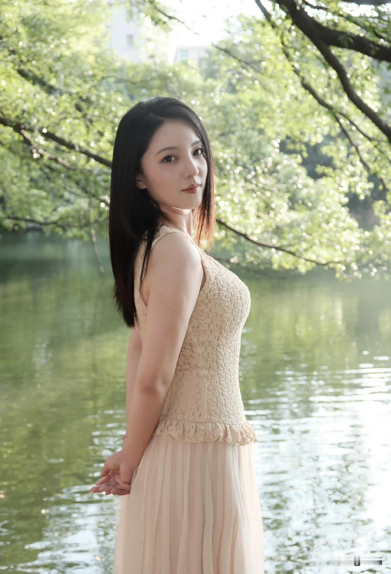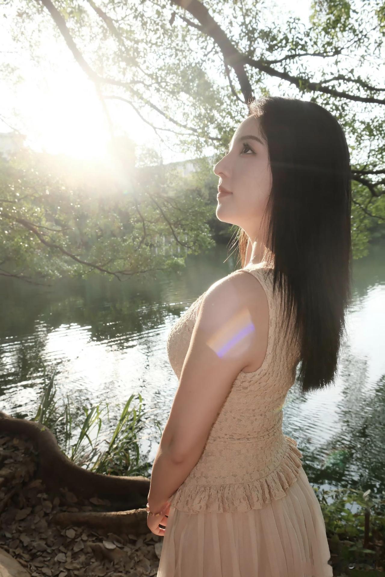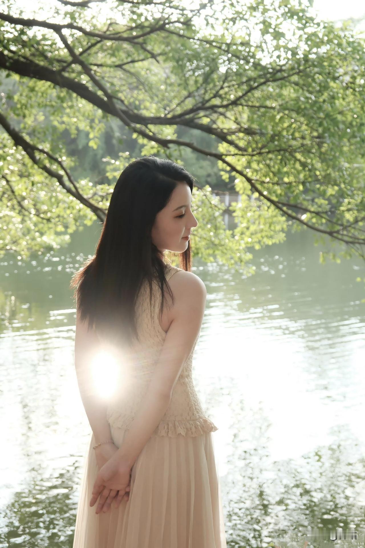 美图欣赏,看图写诗 《暮阳湖畔》 树影婆娑水色柔, 浅杏裙裾韵难收。 流光吻过香肩处, 万种风情画里留。 《湖光细语》 碎金似的阳光撒在湖面。 微风轻抚她的脸庞, 树影在她肩头摇晃, 湖波在她眸里荡漾。 每一缕柔光都在诉说, 这是春天写给尘世的温柔诗行。 图片来源于网络