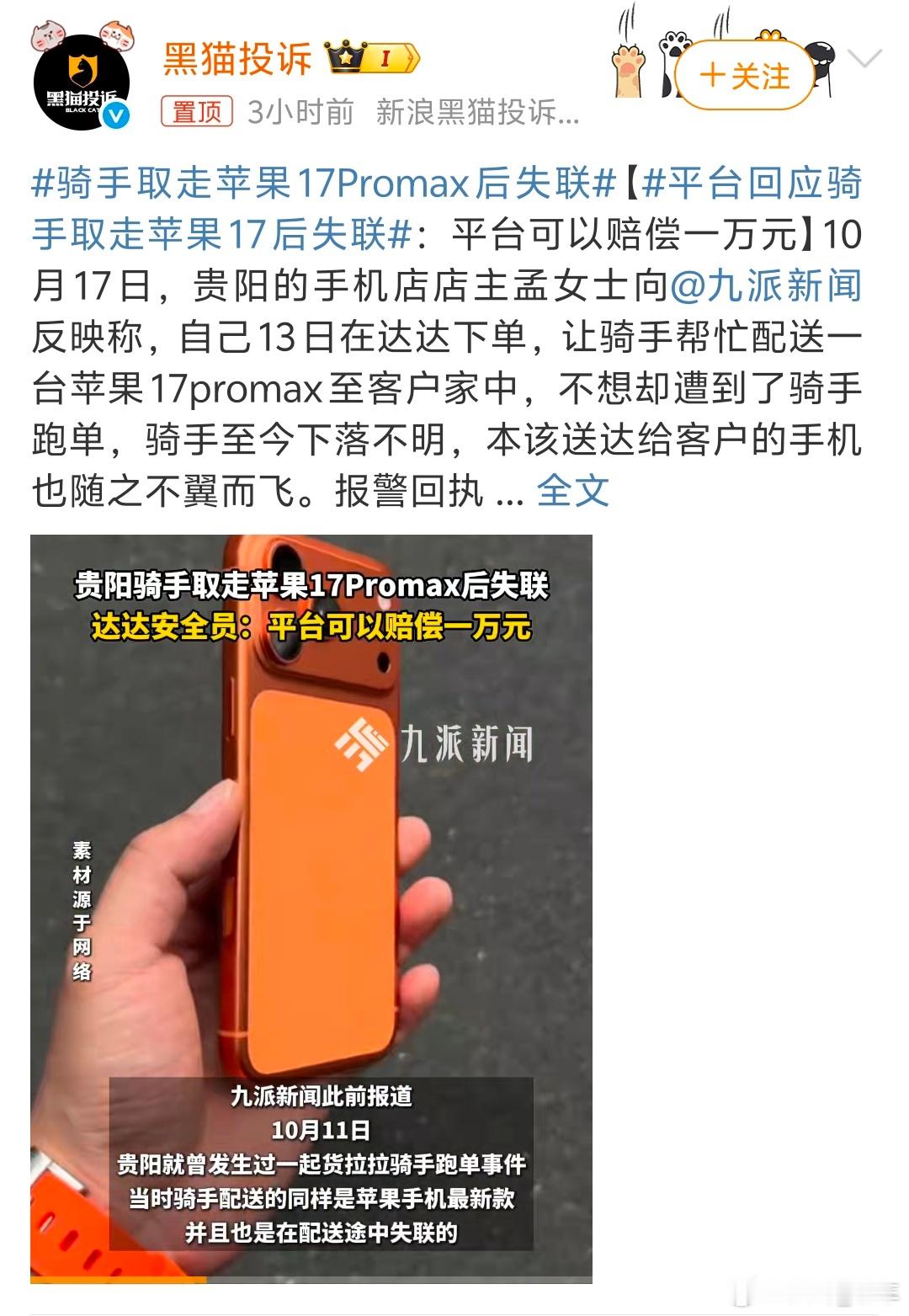 配送员虽实名,贵阳一月两起骑手携苹果新机失联。平台赔万余元但要等一月,高价值件配送需补审核监管漏洞。