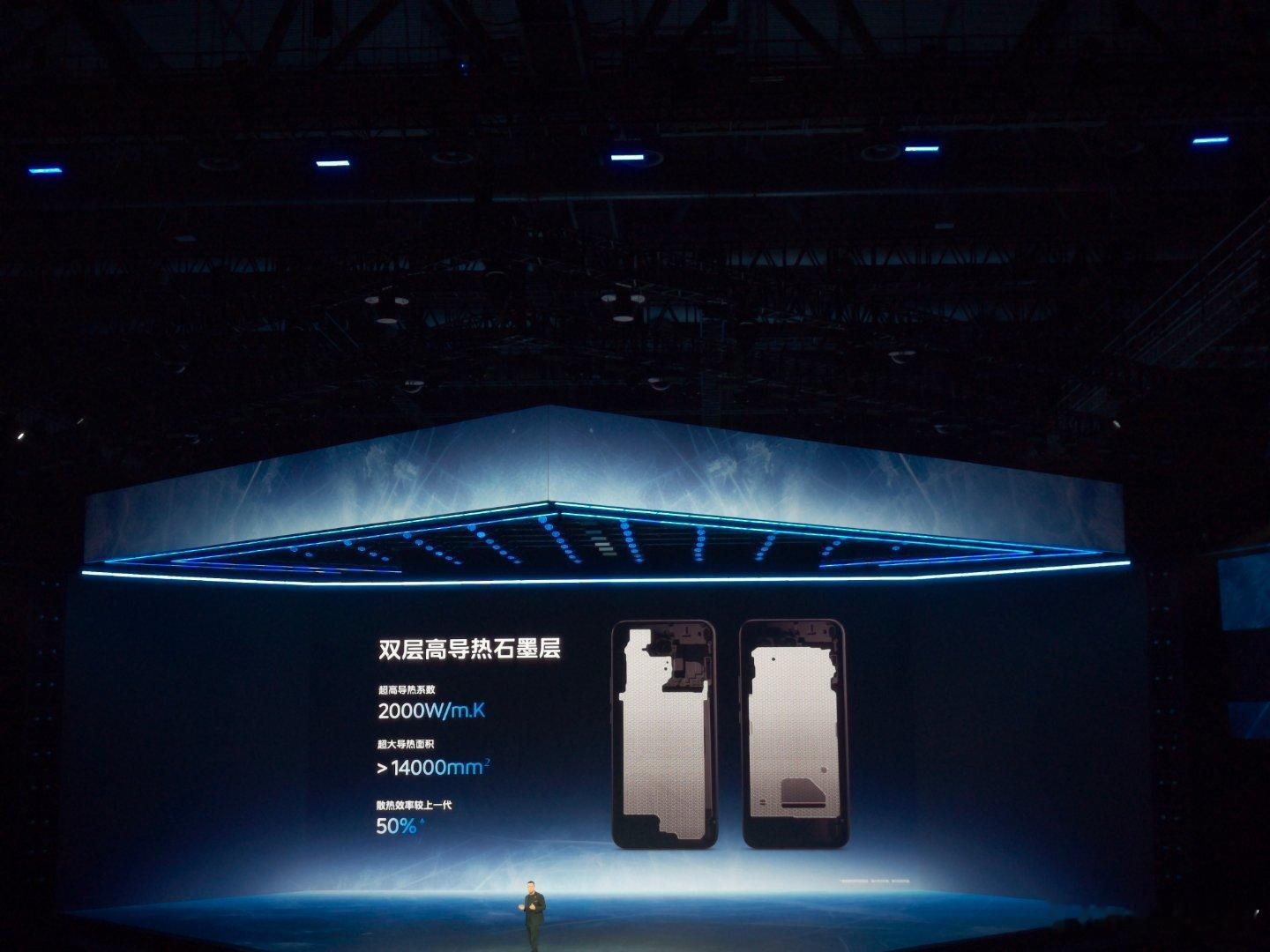 屏幕内部和电池上内置两层高导热石墨,导热系数2000W/m.K,导热面积超14000mm²。