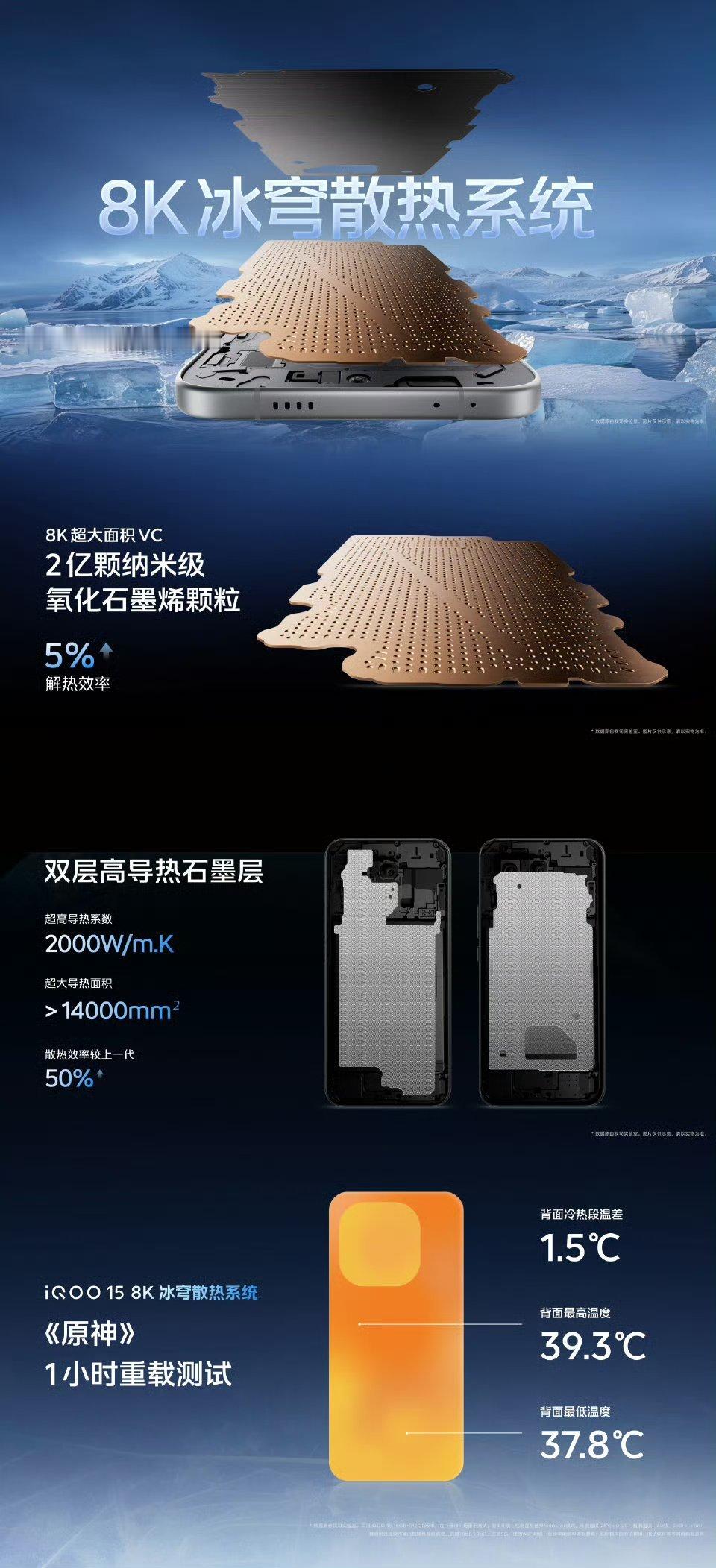 ②屏幕内部和电池上内置两层高导热石墨,导热系数2000W/m.K,导热面积超14000mm²。