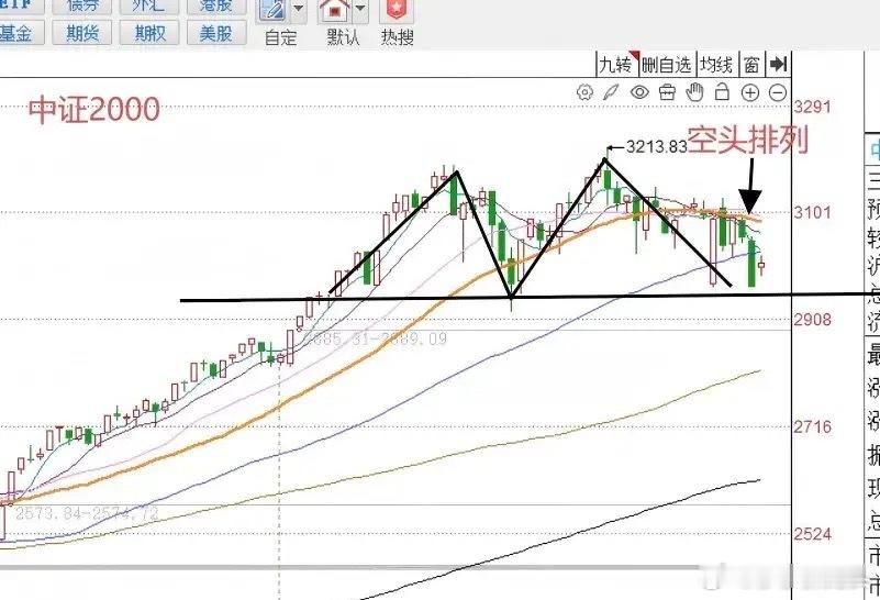 第三,今天小盘个股全线反弹,代表小盘个股走势的中证2000指数涨1.43%。从中证2000指数的角度来观察,目前中证2000指数有比较明显的双头倾向。并且在。最近几个交易日,出现了多周期均线拐头向下的空头排列走势。今天虽然出现跳空高开反弹,但是大家可以从图二发现中证2000指数反弹的幅度,k线实体非常小,成交量也典型的缩量。个人认为这个位置还需要进一步防止中证2000指数,有跌破双头颈线位置的可能性。