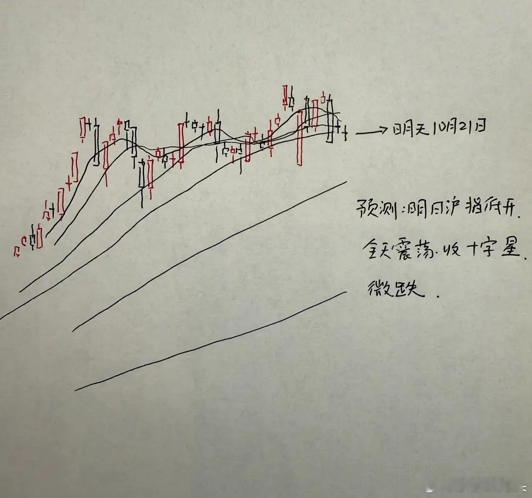 所以,综合以上分析对于当前市场的走势,莎莎认为目前还需要进一步观察才能得出市场短线止跌的信号。预计明天市场指数会在近期的上升支撑线的支撑下再形成一颗震荡的十字星。那么明天A股到底怎么走?大家请看图三关于明天走势莎莎手绘的预测图: