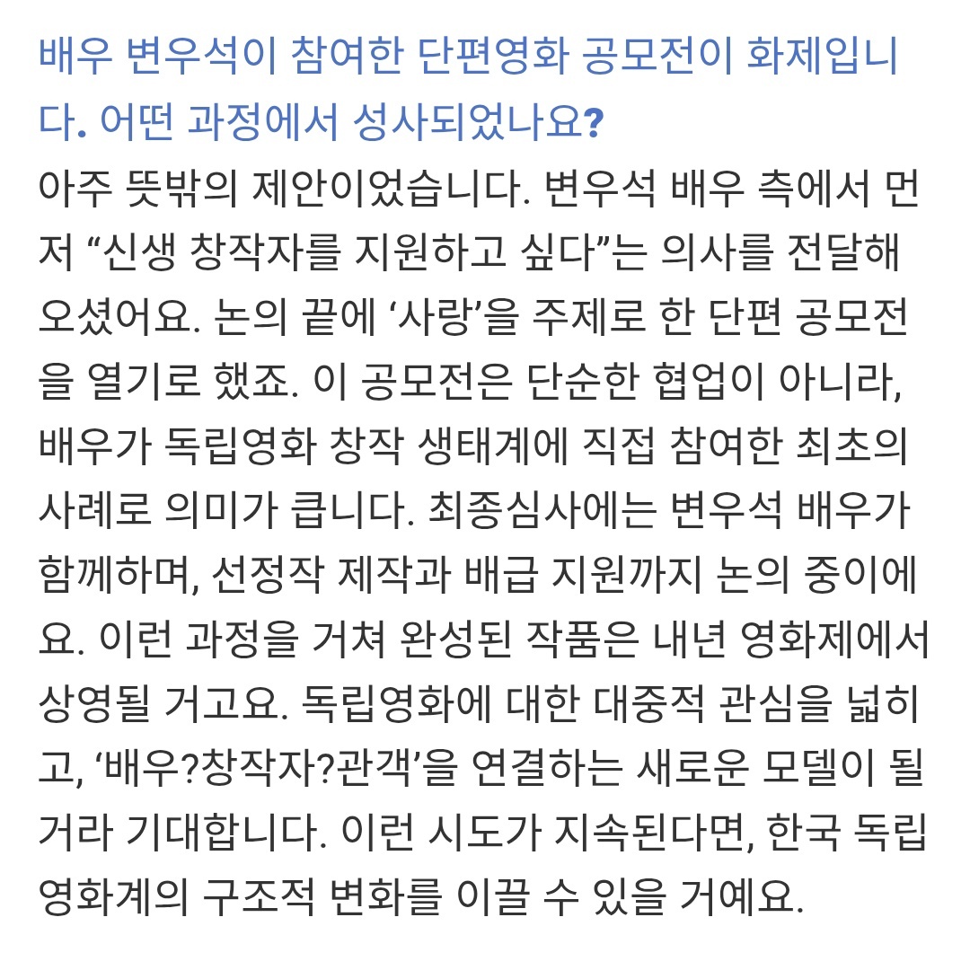 边佑锡将亲自参与最终评审,并正在讨论对入选作品提供制作及发行支持。通过这一流程诞生的作品将在明年电影节中亮相,我们希望期待此举能拓宽大众对独立电影的认知,构建连接「演员·创作者·观众」的新型模式。若此类尝试能持续开展,有望推动韩国独立电影产业实现结构性的变革。
