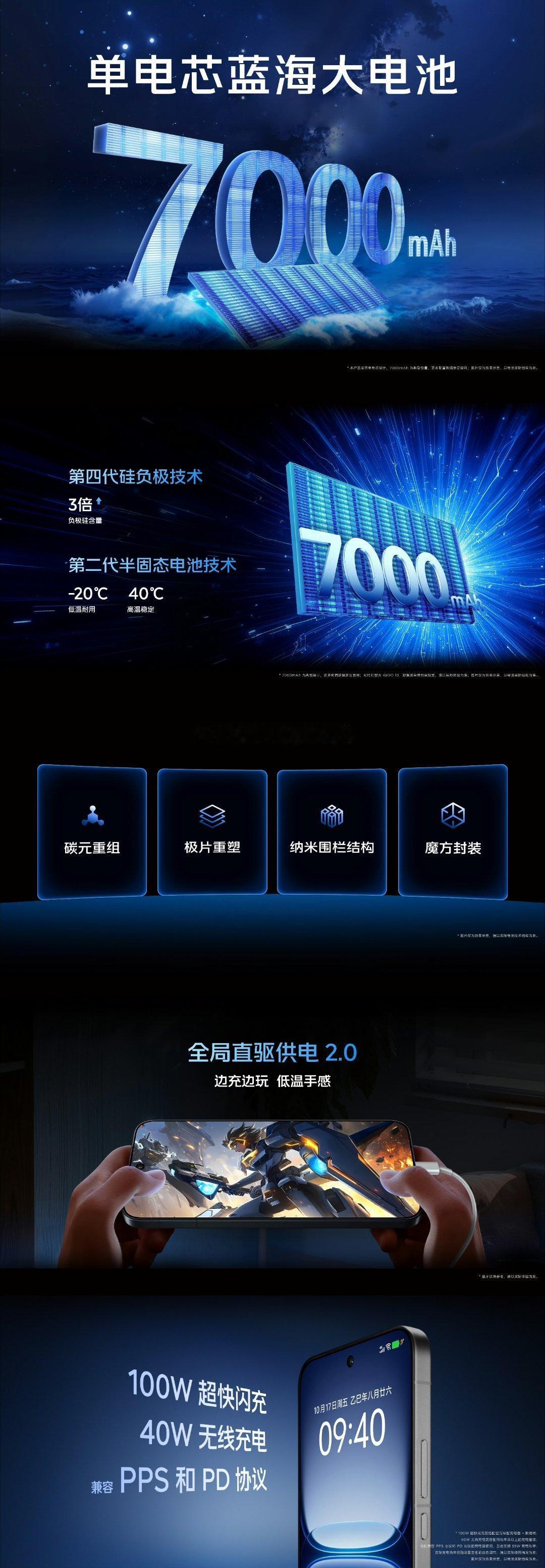 7000mAh单电芯蓝海电池,支持100W超快闪充及40W无线快充,兼容PPS和
