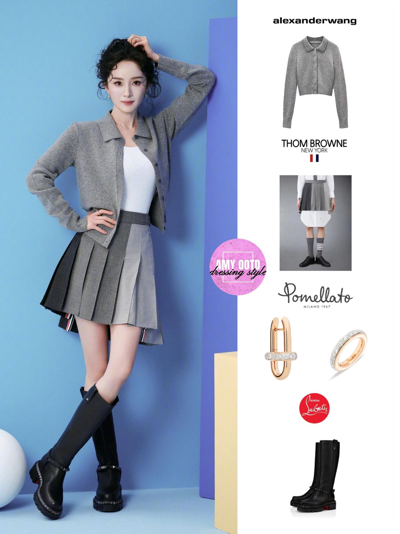 杨幂的直播造型太会玩“风格对冲”了!Alexander Wang短款针织开衫搭Thom Browne百褶裙,学院感里藏着精致细节;脚踩Christian Louboutin厚底长靴,再用Pomellato珠宝点缀,把“羊毛卷少女感”和“甜酷辣妹风”融合得恰到好处,在直播里走出了“学院风天花板”的既视感~ 杨幂 杨幂穿搭