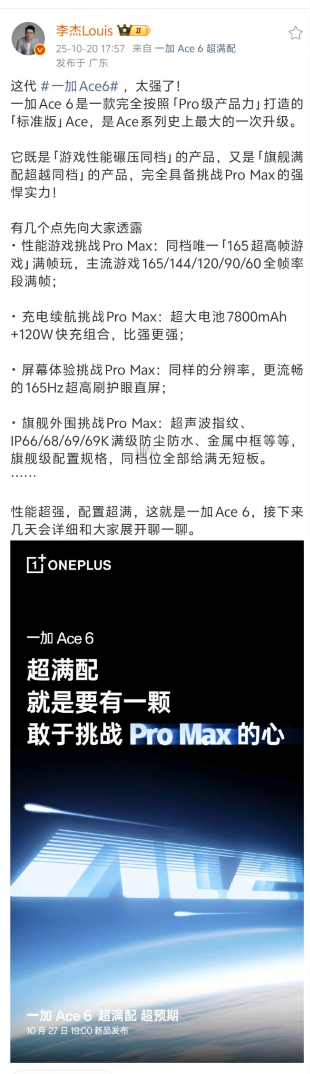 这年头,性能旗舰都在宣传“标配就是满配”,但真把性能卷到天花板的,还得是一加。看Louis的爆料,一加 Ace 6不仅做到了旗舰显示器才有的165Hz高刷,并对《和平精英》、《三角洲行动》等主流游戏进行适配,还有7800mAh超大电池+120W快充的王炸续航组合,再加上超声波指纹、IP66/68/69/69K 满级防尘防水、金属中框等等,旗舰级配置规格直接拉满!Pro Max?一加Ace 6打的就是「Pro Max」!