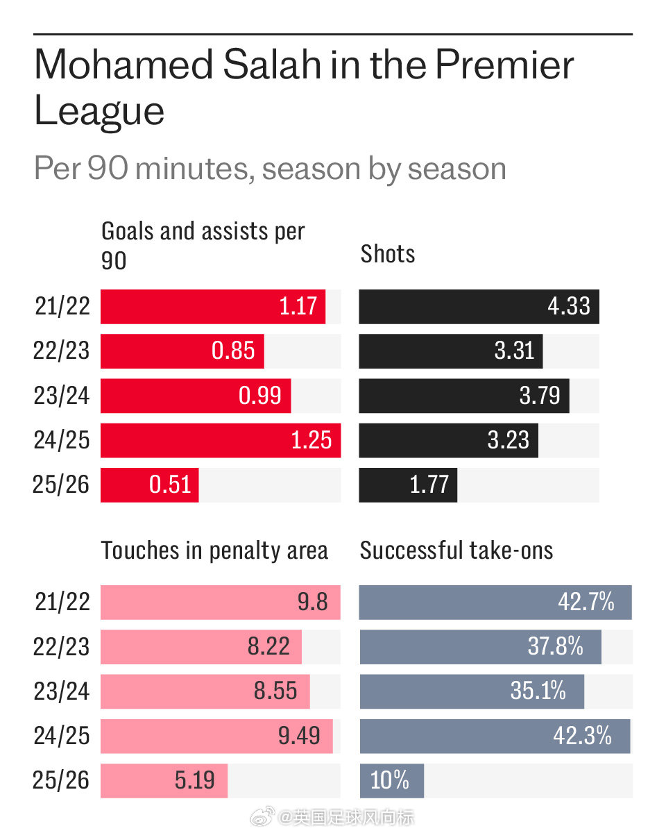 【萨拉赫状态明显下滑】利物浦前锋萨拉赫,最近5个英超赛季,场均进球助攻次数、场均射门次数、场均禁区内触球次数,以及场均过人次数对比。