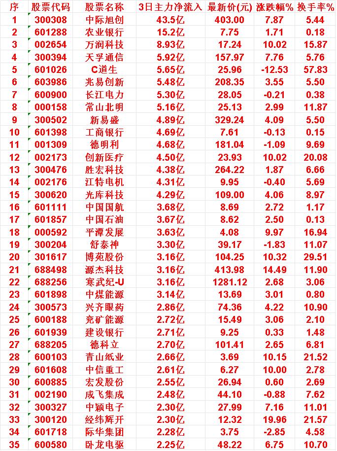 10月21日,前3天主力大幅买入的35名单! 中际旭创:3日主力净流入43.5