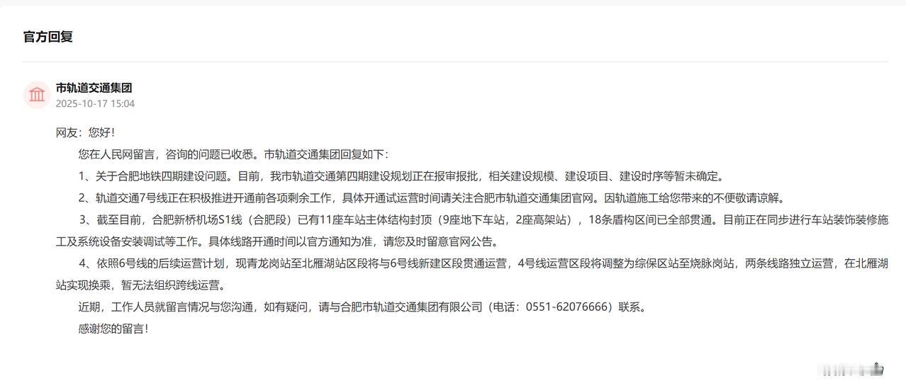 合肥地铁相关的问题。 1、关于合肥地铁四期建设问题。目前,我市轨道交通第四期建设规划正在报审报批。 2、轨道交通7号线正在积极推进开通前各项剩余工作。 3、截至目前,合肥新桥机场S1线(合肥段)已有11座车站主体结构封顶(9座地下车站,2座高架站),18条盾构区间已全部贯通。 4、4号线与6号线暂无法组织跨线运营。