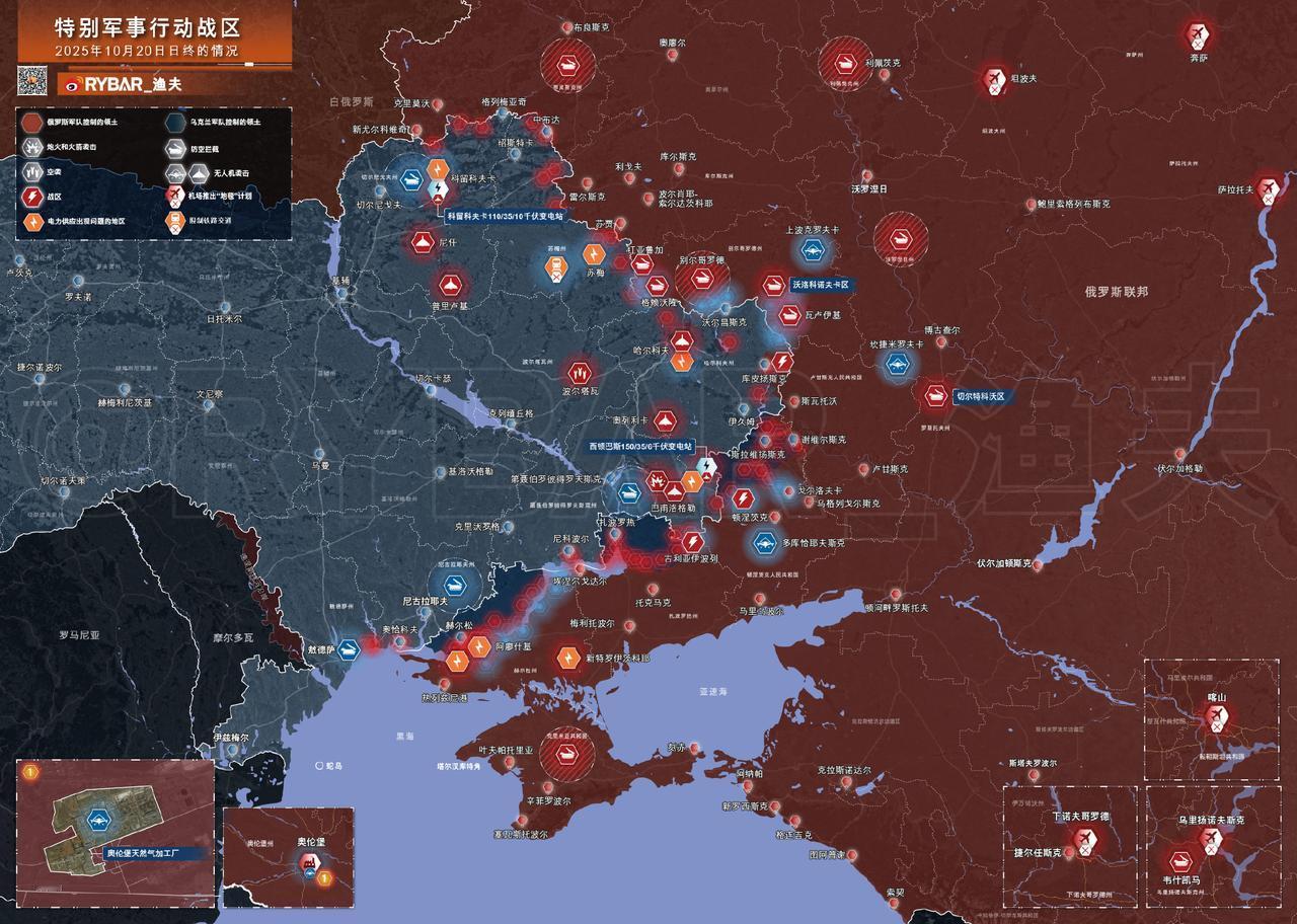 🚩特别军事行动战区2025年10月20日日终的情况 俄军对切尔尼戈夫州多处能源设施实施打击,同时袭击了巴甫洛格勒郊区的变电站及选矿厂。 🔻各方向具体战况: ▪️斯洛博赞斯科耶方向:俄军将敌军逐出博洛戈夫卡周边区域。 ▪️ 库皮扬斯克方向:乌军实施反攻并突入佩夏诺耶西郊。 ▪️ 波克罗夫斯克-米尔诺格勒方向:俄军在波克罗夫斯克西部及中部区域持续推进,并已在米尔诺格勒东郊展开战斗。 ▪️新帕夫洛夫卡方向:俄军扩大在莫洛杰茨科耶周边的控制区,并向新帕夫洛夫卡市方向发起新一轮进攻。 ▪️东扎波罗热方向:“东方”部队集群已进入五一村,并向新格里戈罗夫卡以北区域展开攻击。 俄乌冲突新局势俄军最新进展 来源:RYBAR_渔夫