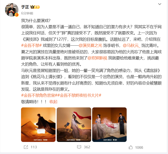 于正提到参与演戏是为了减肥,此外他还表示夏之光的演技在流量群体中被低估,这些表述
