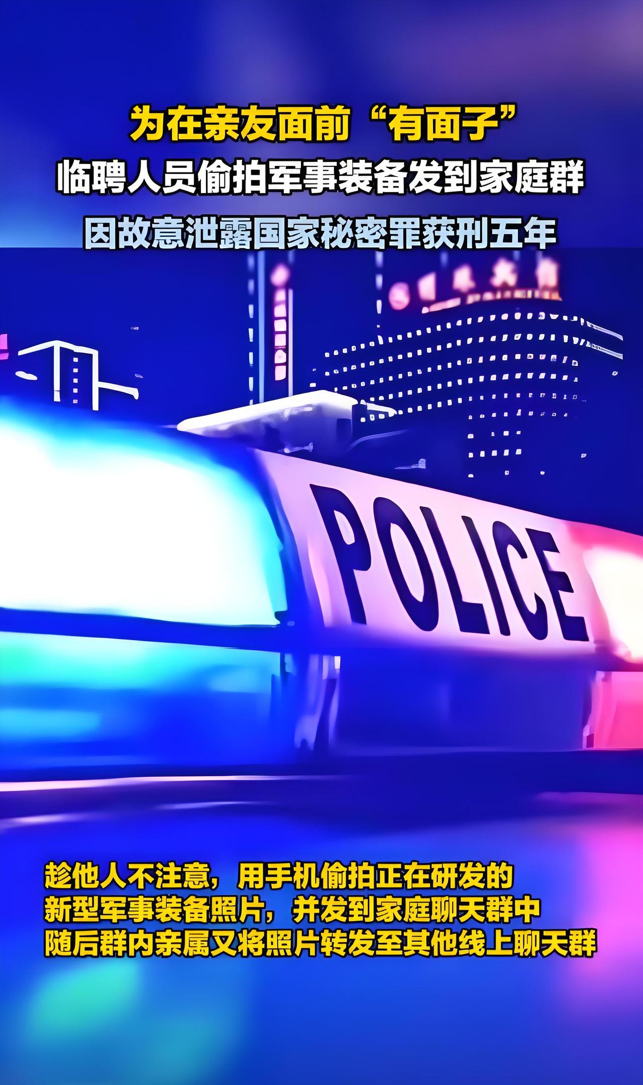 家庭群炫耀新型军事装备,临时工五年刑期警示谁? 某国防军工单位临时聘用人员张某为在亲友面前炫耀,用手机偷拍正在研发的新型军事装备照片发到家庭群,导致涉密信息扩散,被判处有期徒刑五年。这起案例揭示了一个令人深思的现象:在社交媒体时代,"晒"文化已经侵蚀到了国家安全领域。张某的行为表面上是为了在亲友面前"有面子",实则反映了部分涉密人员保密意识的严重缺失。值得关注的是,他作为"临时聘用人员"的身份,暴露出涉密单位在人员管理上可能存在的漏洞。临时工是否接受了充分的保密培训?是否受到与正式员工同等的监管?这提醒我们,保密管理不能有"临时"观念,任何接触国家秘密的人员都应是保密工作的正式参与者。此案也警示我们,家庭聊天群并非"法外之地",涉密信息一旦流出控制范围,其扩散速度可想而知。在数字时代,每个人都是国家秘密的"守门人",这种责任感不应因场合不同而打折扣。军泄密