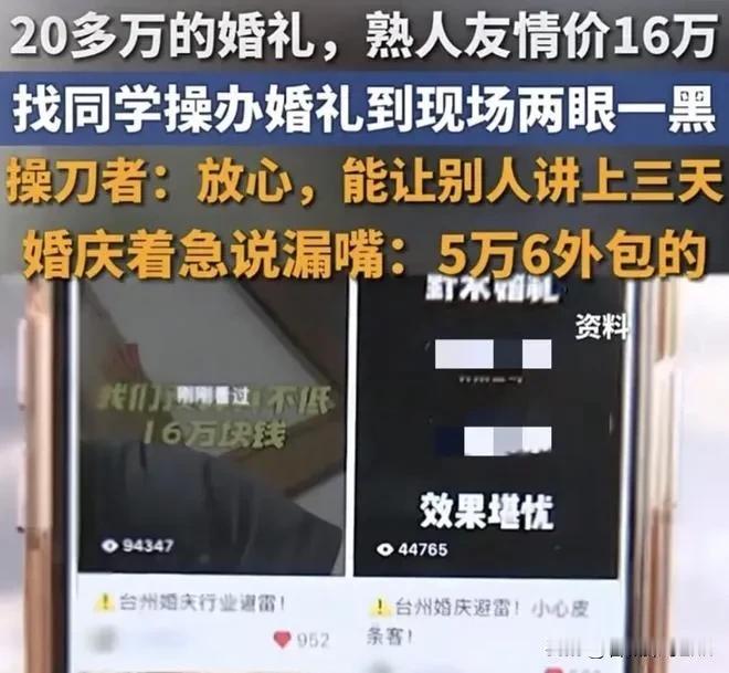 “被熟人杀猪!”浙江台州,女子花16万找老同学操办婚庆,老同学承诺16万做出20多万的效果,保证物有所值!可是万万没想到,婚礼现场非常廉价,连一朵真花都没有!后来才知道,老同学外包给别人5万6,直接吃回扣!! 这位找老同学办婚礼的女子,是台州本地的上班族林晓(化名),和老同学张强(化名)是高中同班同学。 上学时两人还一起搭档过运动会的接力赛,毕业后虽不常见面,但逢年过节总会互相问候,朋友圈里也常给对方点赞。 去年林晓定了婚期,愁着找婚庆公司,翻朋友圈看到张强在做婚庆策划,还晒过不少“高端婚礼”的照片,没多想就主动联系了他。 张强接了这活,拍着胸脯跟林晓保证:“都是老同学,我还能坑你?16万给你按20万的标准来,舞台用进口白玫瑰搭花墙,LED屏是高清无缝的,摄影团队是跟过明星活动的,到时候保准让你和亲戚朋友都满意。” 林晓听着这话,又想起上学时张强靠谱的样子,当场就转了5万定金,连详细的物料清单都没要——她觉得“熟人办事,没必要这么生分”。 婚礼当天,林晓穿着婚纱走进酒店宴会厅,一眼就愣了。说好的白玫瑰墙,变成了塑料假花,花瓣边缘还沾着灰; LED屏是拼接的,中间有条明显的黑缝,播放的预告片还卡了好几次;摄影师就带了个普通相机,连补光灯都没拿,拍出来的照片要么背光要么模糊。 亲戚们私下议论“这婚礼看着也就几万块的水平”,林晓强忍着眼泪走完流程,连敬酒时都笑不出来。 真正戳破真相的,是婚礼结束后收拾场地时。林晓听到两个工作人员聊天,说“这活5万6接的,老板还嫌赚少了”,她心里咯噔一下,赶紧拉住其中一个问情况。 对方没多想,说这婚礼是张强从外面找的小工作室外包的,他们只是来帮忙搭建的,所有物料都是最便宜的款。 林晓拿着这话找张强对质,一开始张强还抵赖,说“工作人员不懂瞎说”,直到林晓拿出录音,他才垮了脸,承认自己怕麻烦,找了熟人的小作坊外包,剩下的钱都进了自己腰包。 林晓说,最让她难受的不是钱,是那份被辜负的信任。 “我宁愿找陌生公司,就算不满意还能光明正大维权,可他是老同学啊,我连合同里的明细都没细问,就信了他的话。” 后来林晓找了消协,又咨询了律师,张强在证据面前没办法,退了8万多块钱,但婚礼留下的遗憾补不回来——那些模糊的照片、塑料的假花,还有亲戚朋友的议论,成了林晓心里过不去的坎。 其实这种“熟人杀猪”的事,在婚庆行业不算少见。不少人觉得找熟人办事“放心、省心”,却忘了“熟人”也可能利用这份信任钻空子:前期用漂亮的效果图画饼,签合同的时候故意模糊物料品牌、规格,等收了钱就找低成本的外包团队,把差价揣进自己口袋。 而受害者往往因为“碍于情面”,一开始不好意思追问细节,等发现问题时,要么已经来不及,要么维权时还得顾及“同学情、朋友情”,反而更被动。 不是说不能找熟人办事,而是不管关系多好,涉及到钱和重要事务时,该有的规矩不能少。 比如办婚庆,得要详细的物料清单,注明鲜花品种、设备型号、团队资质;签合同要写清楚违约责任,万一出现货不对板该怎么赔偿;付款时留好凭证,不要私下转账不留记录。 信任是人际交往的基础,但不能成为“被宰”的理由,只有把丑话说在前面,把细节落到纸上,才能避免“熟人”变成“仇人”。 一场婚礼的意义,在于记录幸福的瞬间,而不是让信任变成遗憾的导火索。希望林晓的经历能给大家提个醒:不管办什么事,理性永远要比“情面”重要,别让一时的放心,换来长久的糟心。 各位读者你们怎么看?欢迎在评论区讨论。