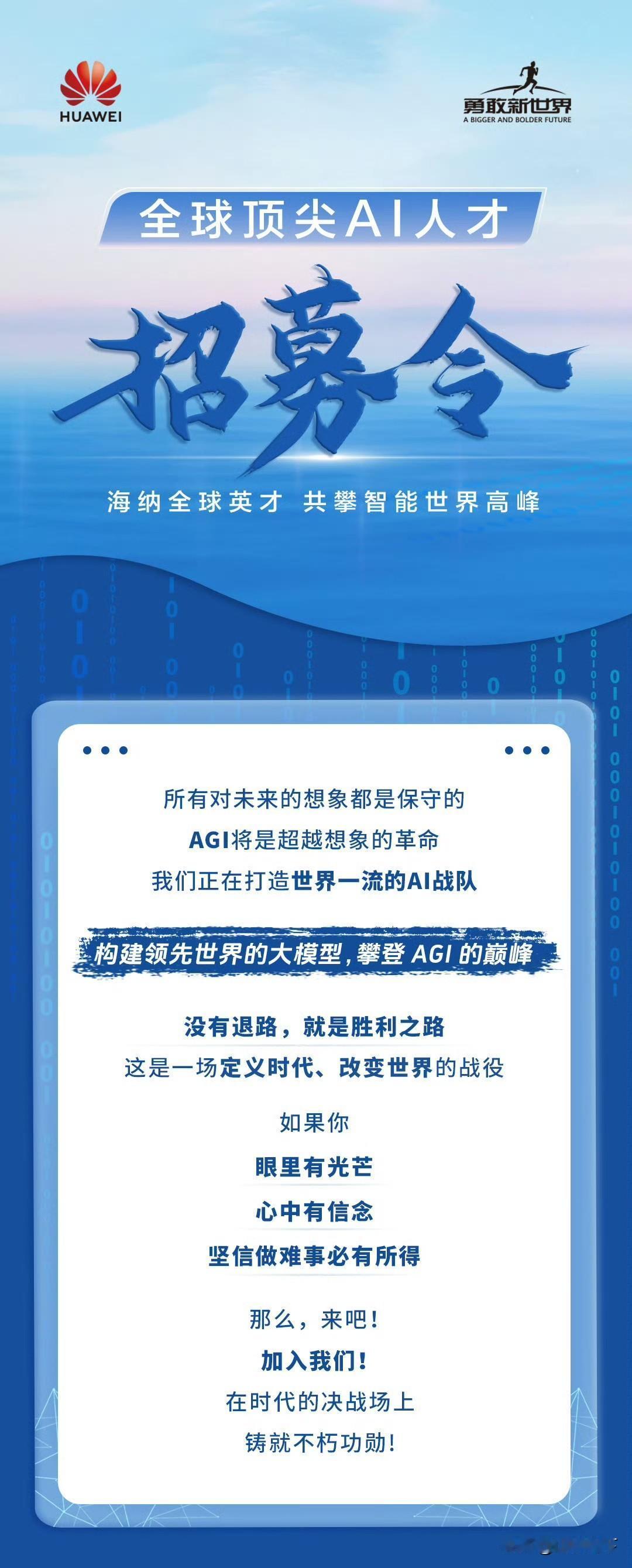想进华为工作的注意了,余承东发布全球AI人才招募令,合适的朋友可以冲了,毕竟现在工作不好找,进大厂还是很香的,可惜我不够格。 这是余主任,继通信业务、手机、车联网业务之后,又一个别人没做好,需要自己亲自下场力挽狂澜的业务,战无不胜的你,估计这是终极之战了,一定要成功啊,你是我的偶像!余承东 华为AI技术
