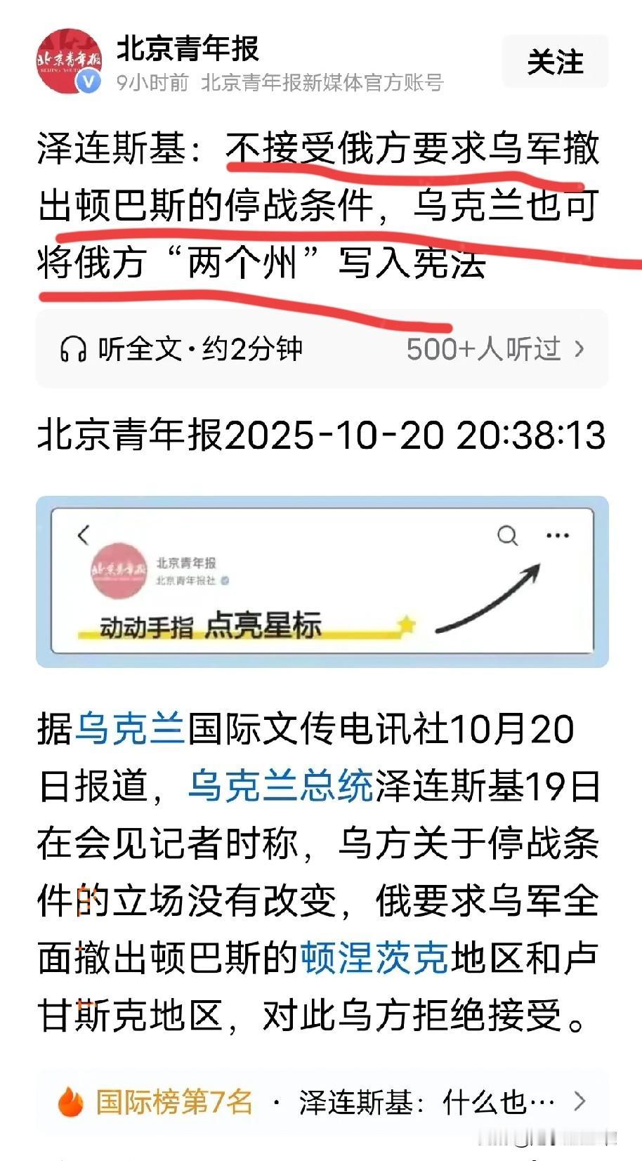 据报道,乌克兰总统泽连斯基在接受媒体采访时表示,乌克兰的停战条件没有改变,绝不接
