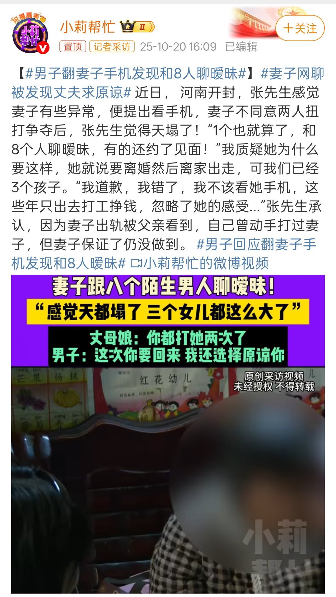 男子翻妻子手机发现和8人聊暧昧这年头这种事还是有的。农村里好多男子都是外出打工,女子在家带娃照顾老人。因为生活,不得不呀!说实话,遇到戴帽这个事真的很少有男人能冷静[允悲]