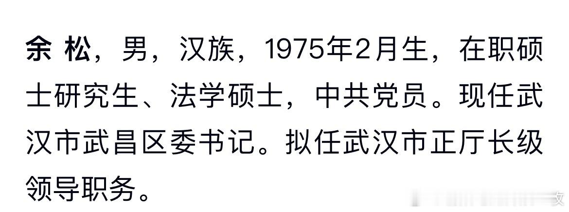 武汉市武昌区委书记余松,拟任武汉市正厅长级领导职务。热点现场