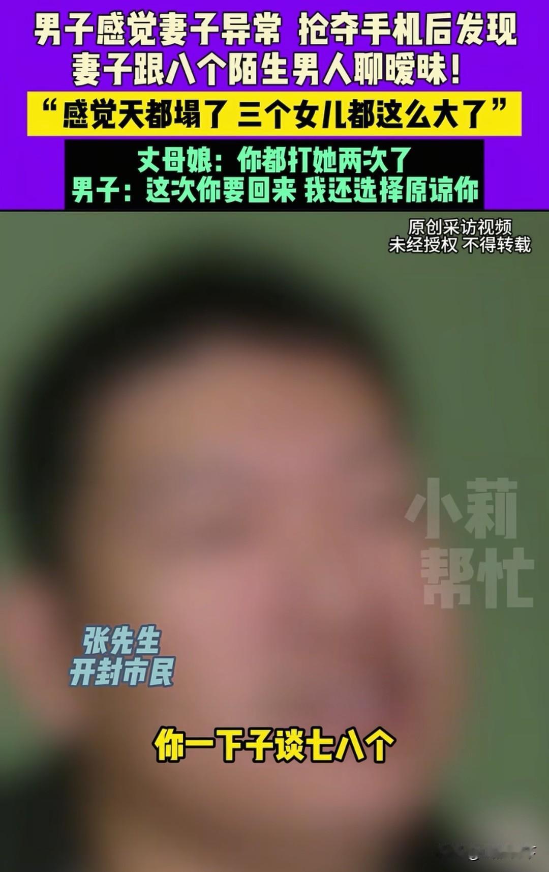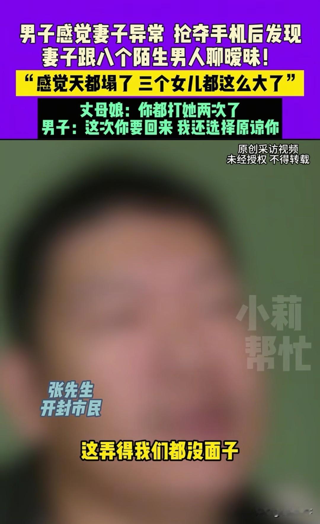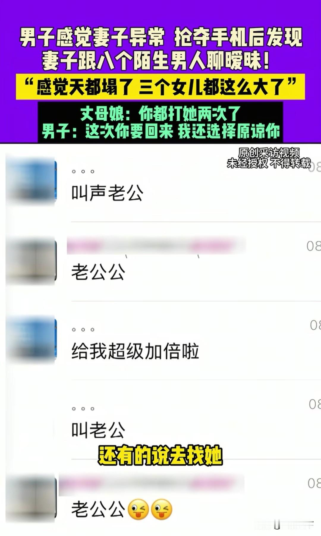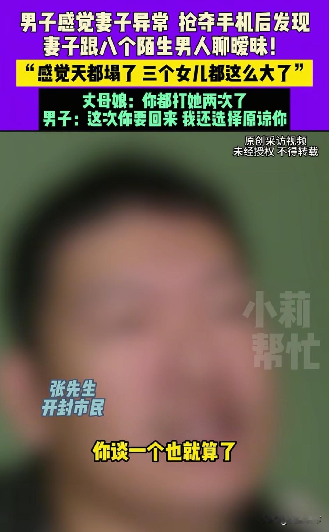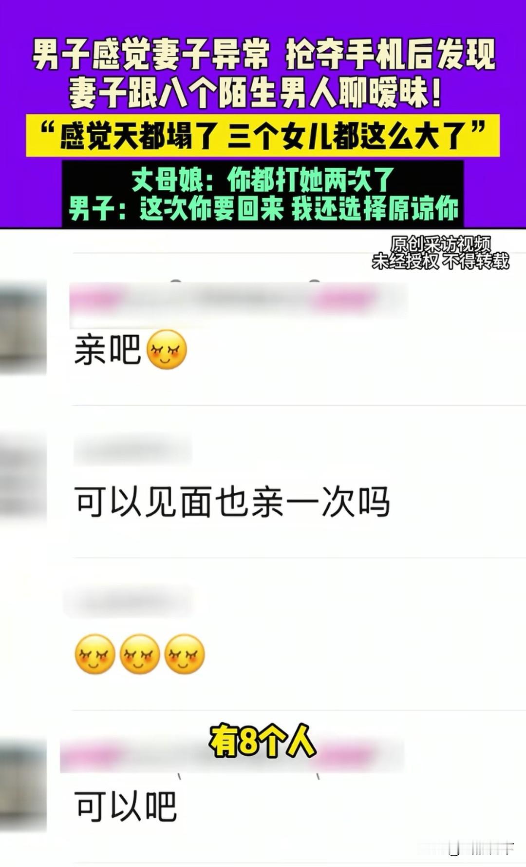 一个我都谈不明白,她居然能同时谈8个,这真是时间管理大师啊,河南一男子感觉天塌了,因为他发现自己老婆和8个人聊暧昧,有的还约了见面,甚至妻子出轨还被父亲看到了,这也太炸裂了。 据报道该男子和妻子育有3个孩子,妻子被抓包后毫无愧色,只要男方一说这事她妻子就要离家出走或者闹离婚,即便如此,男方还是决定屈服给妻子道歉称不该看她手机,还说谈一个就算了,你一下子谈七八个,这弄得多没面子。 不是,大哥你是忍着神龟吗?出轨的理直气壮,抓包的反而认错?卑微到这份上真看不下去了,还有这三个孩子你确定都是你的吗[捂脸][捂脸]