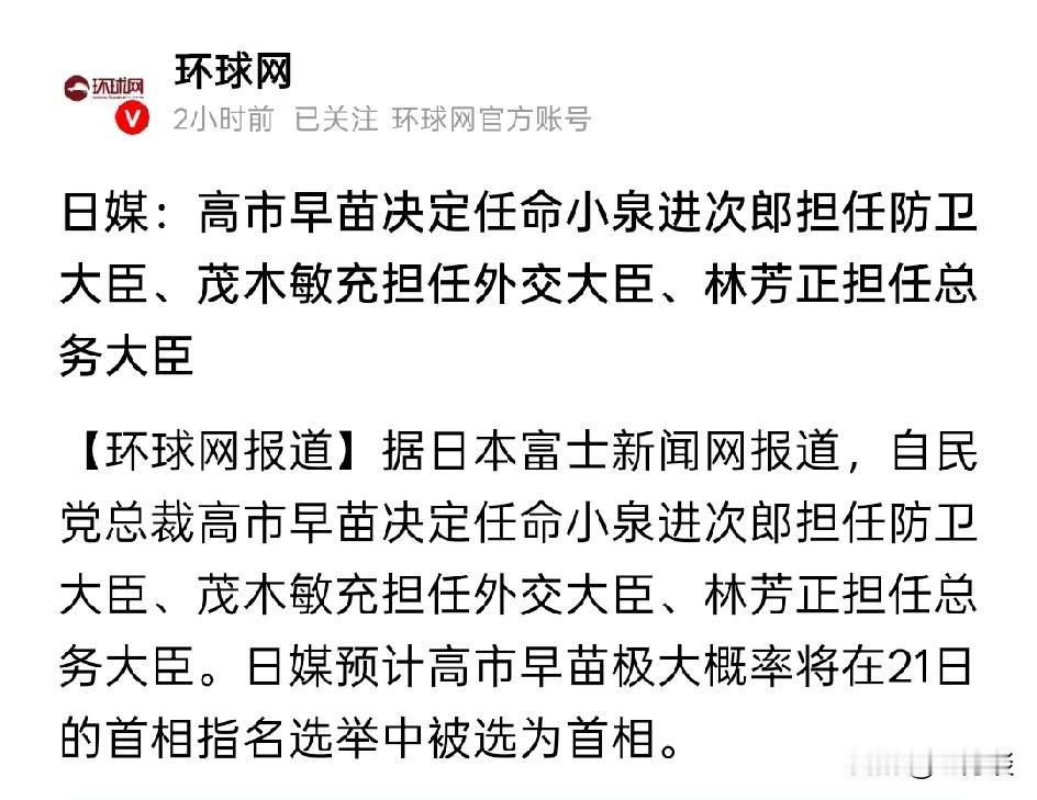 高市早苗开始履行日本首相的职责了!认命防卫大臣、外交大臣、总务大臣,之前说高市早苗的首相梦要破碎了,想不到她找到了新的合伙人,首相看来稳了,毕竟都开始认命大臣了!日本首位首相就要诞生了,这也是对华特别强硬的首相,而且非常不友好,应对将会很棘手!这个首相就看能熬多久了!