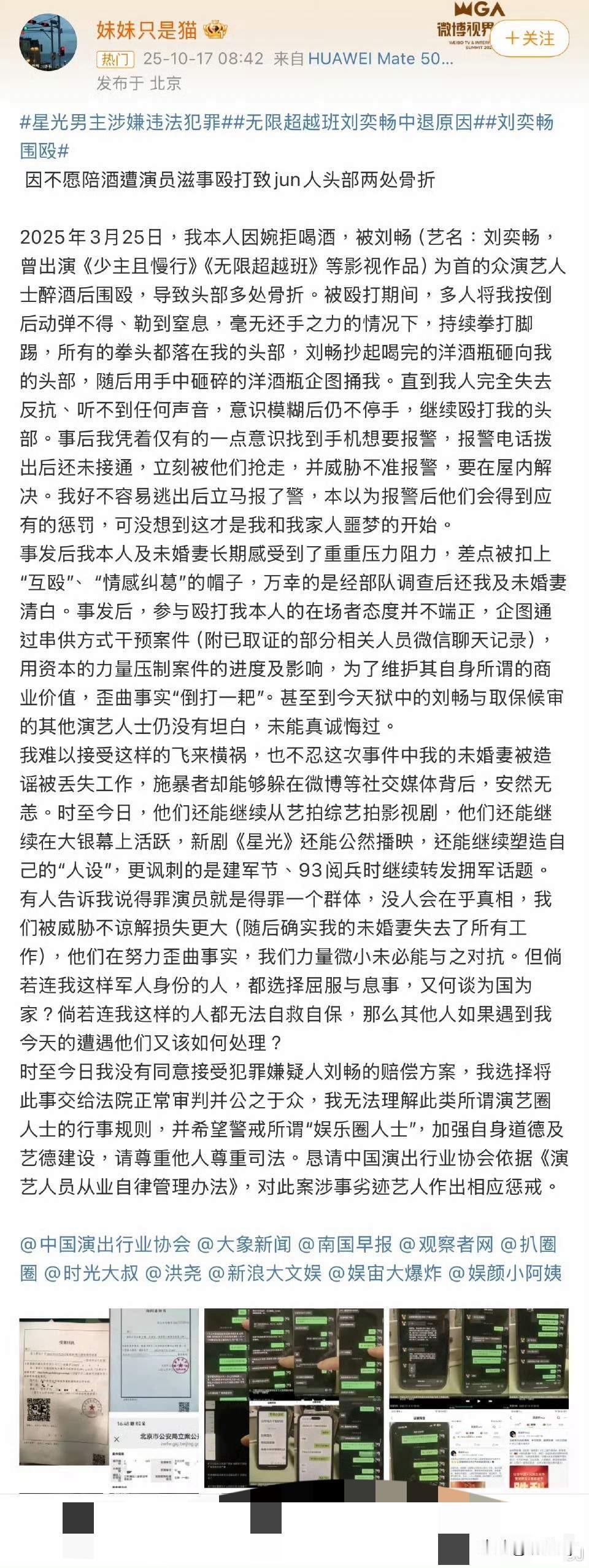 不要拿喝酒说事,一群人对一个军人动手,就是在挑战人民解放军的底线,挑战国家,挑战全国人民! 不管是哪里有灾难,最先出手的是人民子弟兵,他们不光在保家卫国,还在保护着人民财产的安全!哪里有需要哪里就能看见军人的身影! 殴打军人是不可原谅的,不管他喝没喝酒,对这样嚣张跋扈的人一定要用法律的威严去制裁他们! 刘奕畅为首一伙人的行为给社会带来了极大的不良影响,必须严惩绝不能手软,不光是给部队梁先生一个交代,也是给全国人民一个交代! 即便不是军人是老百姓你也没有权利殴打,法律是神圣的,在法律面前人人平等!期待着法院的公平判决! 演员刘奕畅