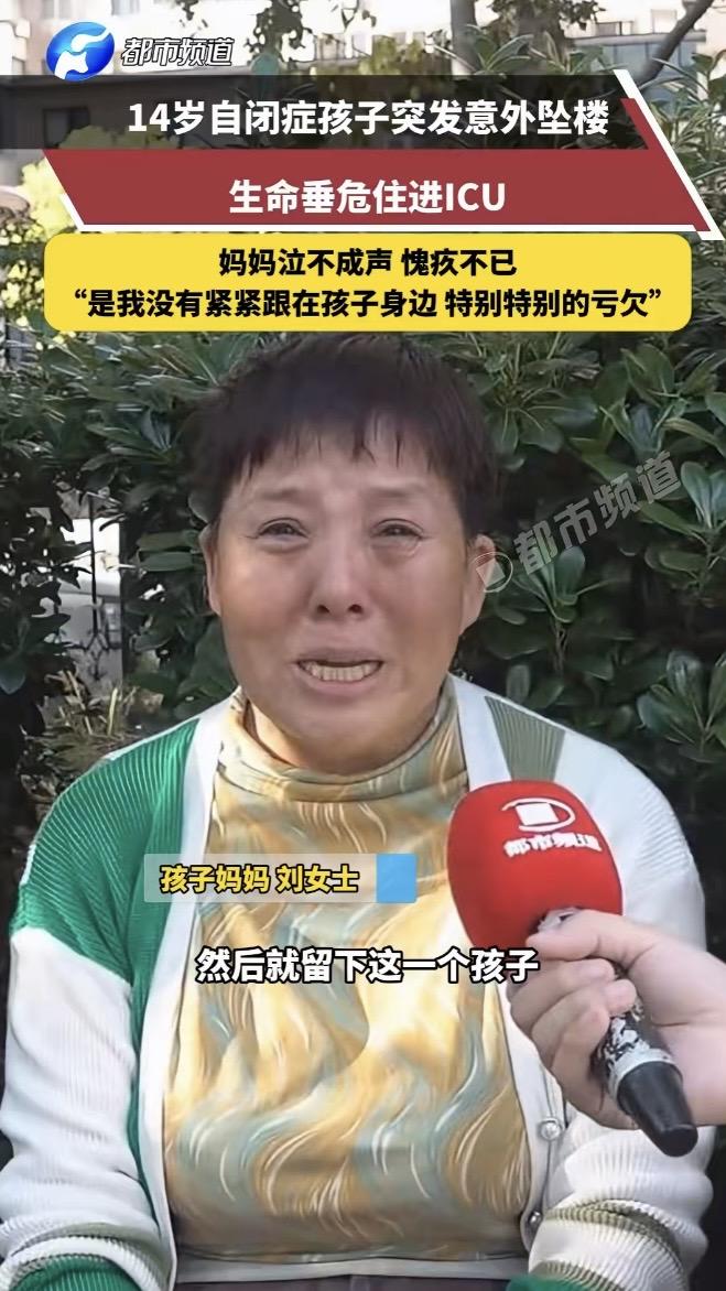 14岁自闭症男孩坠楼妈妈崩溃大哭! 河南刘女士的天,在10月11日中午塌了——14岁的自闭症儿子意外坠楼,现在还躺在ICU里没醒。 她哭着说,孩子摔得“骨头碎了,胸膛大出血”,刚做完开胸手术,接下来还得闯开颅的关。丈夫走了多年,她一直打零工拉扯孩子,一边挣钱一边盯着儿子的一举一动,可这次还是没看住。“是我没有紧紧跟在他身边,特别特别亏欠”,话里全是自责。 自闭症孩子本就容易对危险没概念,需要寸步不离的照护。对刘女士来说,这不是简单的“意外”,是单亲妈妈独自撑家时,藏在日常里的无力——要赚生活费,就没法24小时盯着孩子;想守着孩子,又怕没了收入。 现在只盼着孩子能挺过手术,也希望这位妈妈能少点自责,她已经拼尽全力在护着孩子了。