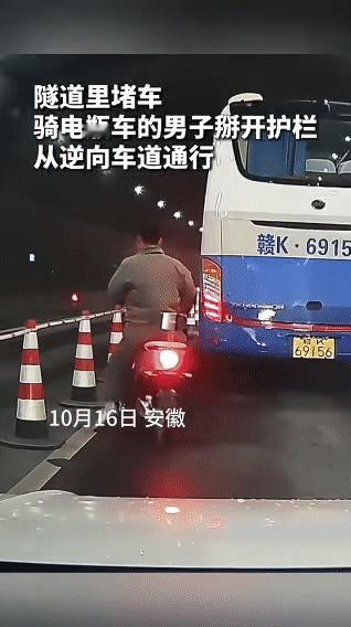 隧道堵车现文明反差:男子拆栏逆行,女士复原护栏后归队 10月16日安徽某隧道
