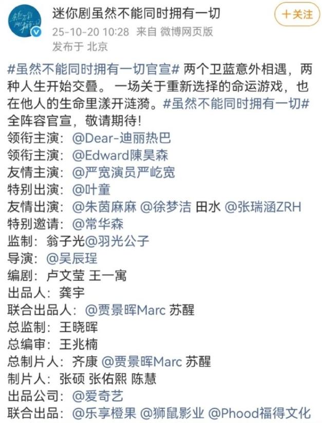 迷你剧《虽然不能同时拥有一切》全阵容官宣! 迪丽热巴搭档陈昊森,常华森特别邀请出演本剧,值得注意的是,这部剧是迪丽热巴近几年第一部由爱奇艺制作的影视剧,说明她已经脱离鹅厂,开始合作更多平台了。
