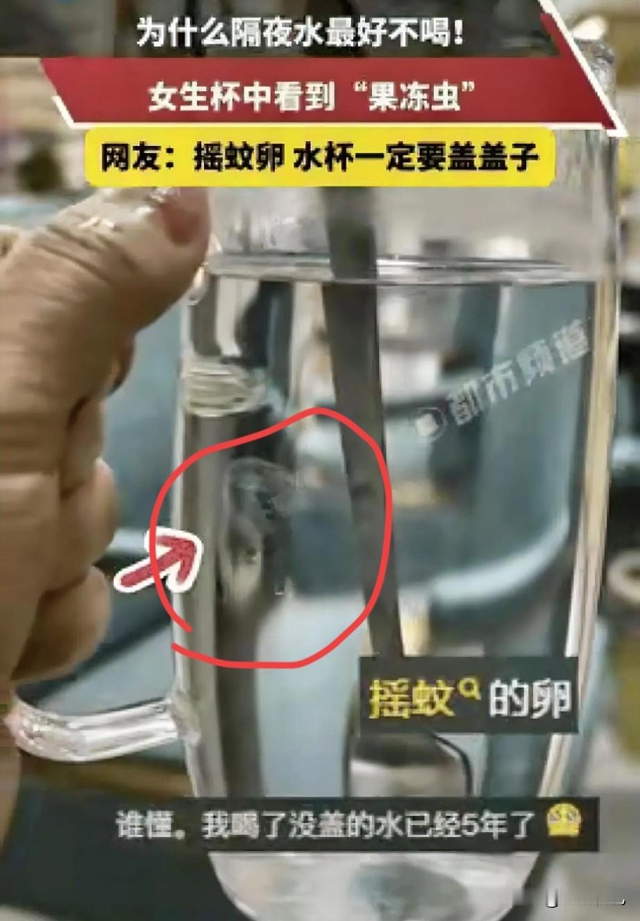 有一个女孩,晚上睡觉前倒了一杯水,第二天起床后准备喝水时,发现昨天倒的水杯里有一串透明的摇蚊卵。 女孩吓得不轻,摇蚊卵都在水杯里了,那岂不是说明她喝下去的水里也有摇蚊卵?这真是太恶心了,真不敢想象! 这件事也提醒我们,最好喝有盖的杯子,不喝隔夜水,因为谁知道隔夜水里藏着啥脏东西或者虫子卵。 很多人喝水时根本不会检查一下自己的杯子,不知道自己什么时候中招。 看完这件事儿,你是不是也要检查一下家里杯子里有没有虫子卵? 还敢喝隔夜无盖水吗?