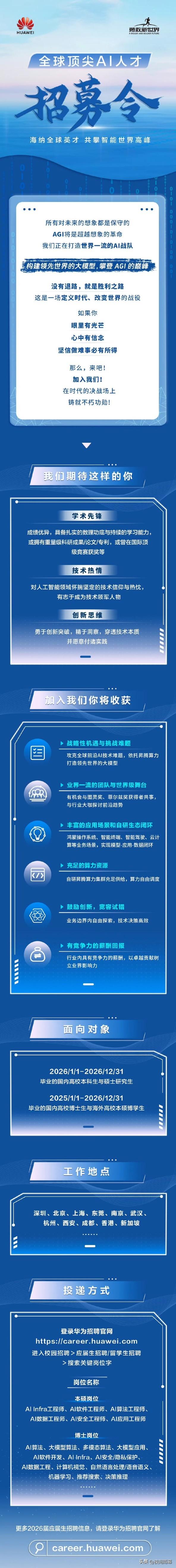 10月20日,华为招聘官微发了“全球顶尖AI人才招募令”,目标超明确,就是打造世界一流AI战队,构建领先大模型,攀登AGI巅峰。余承东以多重身份转发,还鼓励大家“胸怀王者气,共攀最高峰”。这也是他兼任华为IRB主任后的首条相关微博。 招募面向特定毕业时间的国内外高校学生。要求人才是学术先锋、有技术热情、具创新思维。待遇也很诱人,有竞争力薪酬,能攻克前沿难题、参与领先项目,还能和大奖得主共事,有充足算力自由调度。华为这是要在AI领域大干一场啊! 华为AI技术 AI余承东 华为AI技术 AI余承东 ai人才力量 AI人才短缺 华为AI AI人才热潮 AI人才选拔 ai人才政策
