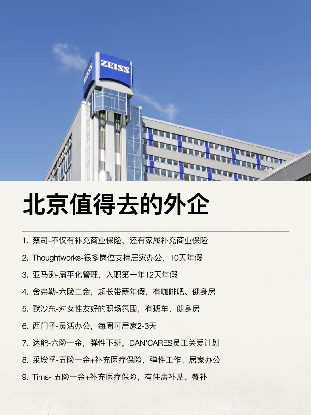 最近很多小伙伴问北京外企,其实首都的外企资源真的很丰富,从国贸的金融巨头到中关村的科技大厂,想要高薪+福利+工作平衡,图上这些公司值得看看 . 北京外企的普遍优势 ✔️普遍14薪起,金融科技行业更高 ✔️六险二金标配,补充医疗覆盖全家 ✔️混合办公模式,告别996 ✔️全球培训资源,晋升体系清晰 ✔️尊重个体价值,工作生活平衡 . 坚持日更✊🏻,帮大家在找工作路上顺利拿到offer! .