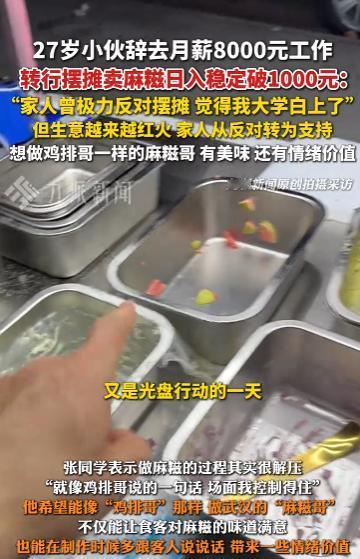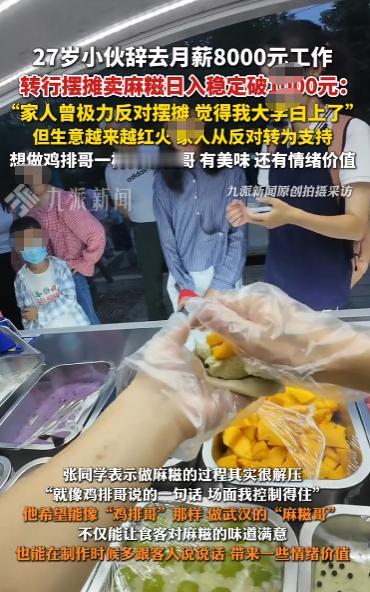 “活该他发财!”10月20日,湖北武汉,一27岁小伙不顾家人反对辞去了月薪8000元的稳定工作,转行摆摊卖起了麻糍,没想到生意越来越红火,日收益稳定破1000元,小伙表示自己想像网红一样做成“麻糍哥”,网友:这是从打工人变成小老板了! 在很多人眼里,拥有一份稳定的工作已经算是成功,可一些年轻人身上带着股闯劲,他们不愿意待在舒适圈里,选择自己创业。 一名27岁的小伙大学毕业后找了份稳定的工作,月薪8000元,这在不少人眼里算得上是份好工作了,可他却突然要辞职去摆摊,小伙家人极力反对,他们觉得去摆摊那大学岂不是就白读了。 小伙不顾家人反对毅然决然辞去了工作,随后专门进修了糕点制作的课程,买了辆三轮车简单装饰后开始就摆摊卖麻糍。 一开始小伙的生意并不好做,日收入300元是常态,可他逐渐发现,麻糍不仅好看还好吃,口味多种多样,深受年轻人的喜爱,于是就来到大学城附近摆摊,果然,生意一下就好了起来,日收益能稳定在1000以上。 据小伙所说,自己做麻糍很解压,他的目标是做成本地的“麻糍哥”,带给顾客的不仅有美味,还有情绪价值。 不少网友认为小伙很理智,他的成功和勇敢挂钩的,这种心中有目标、有信念,行动力还很强的人,能发财一点不让人意外! 信息来源:《27岁小伙辞去月薪8千工作转行摆摊卖麻糍 , 小伙辞职摆摊卖麻糍日入破千 :想做鸡排哥一样的麻糍哥,有美味,还有情绪价值。》九派新闻