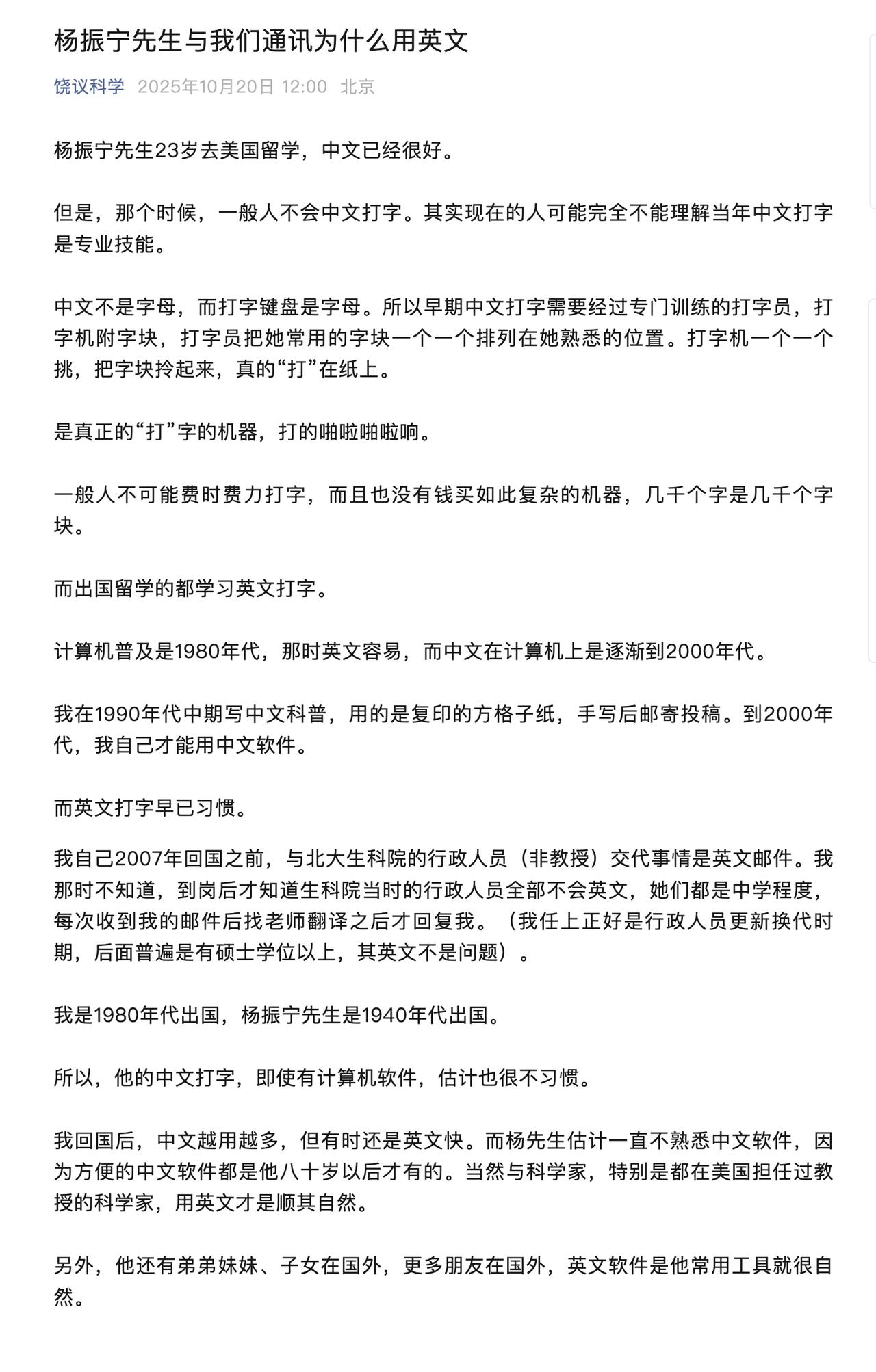 饶议晒了他和杨振宁的邮件往来。 评论区一堆人质问:你们都是中国人,为什么用英文发邮件? 饶议不得不另发一篇解释,真精彩。 网络上的喷子,是任何一点点超出他们知识范围的东西,都要喷一下,顺便上纲上线。 饶老师也是辛苦了! 理解的不用解释,不理解的更不用解释!