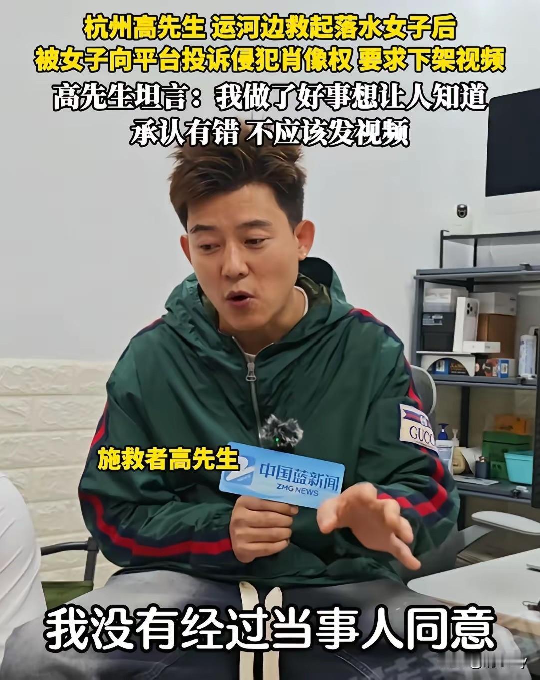 杭州运河救助落水女子的高先生出来道歉了! 高先生说自己没有征得当事人的同意就把视频发到了网上,确实不应该!他当时发的视频也并没有把女子的面部露出来! 高先生说之所以发到网上,是想着自己做了好事,也想让广大网友表扬一下,毕竟别人救人也都发在了网上!就没当回事儿! 为了救河里的女子,高先生自己的脚划伤了,都是自己去医院包扎,破伤风针也是自己掏钱打的,包括自己800多块钱的耳机都掉在了水里! 应该道歉的是被救女子,你完全可以联系高先生把视频给你下架,你没有必要又上传身份证去举报你的救命恩人! 话说回来,肖像权比命都重要!下次走路的时候一定要多注意!千万不能再掉到水里了!