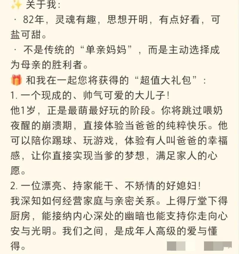 82年的东北小仙女相亲,要求男方年收入60-100万,年龄45岁左右,北京户口。自己有一个1岁的孩子,小仙女自认为端庄贤良,漂亮可人,上得厅堂,下得厨房。找一个能把她的孩子当自己孩子,能一起陪伴他长大的爸爸,一起开启生活新篇章。女生相亲条件 大龄姑娘相亲 大龄女相亲