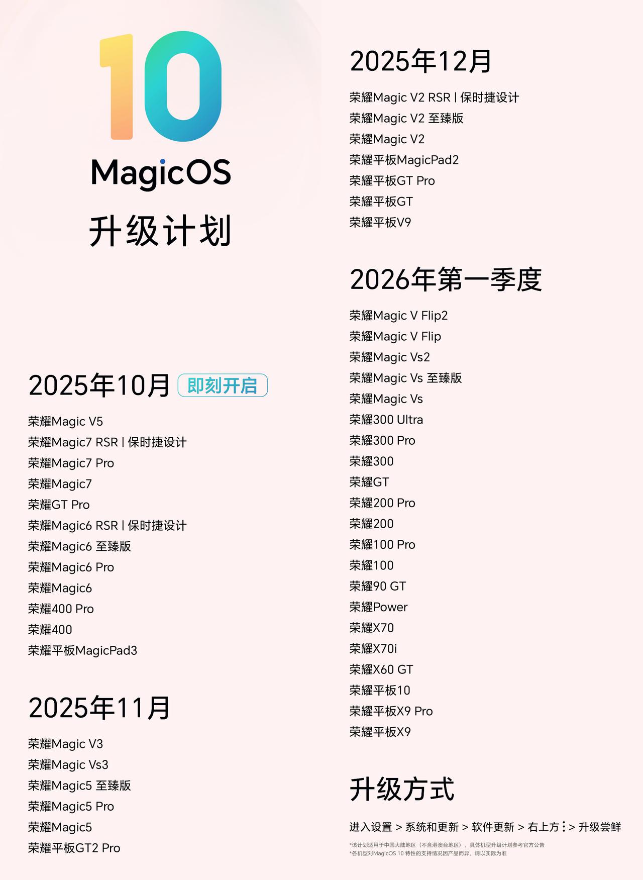 荣耀最新一轮系统更新,支持适配的手机名单,看看你的手机上榜没有 上周荣耀公布了MagicOS 10的升级计划,从10月份开始会陆陆续续给推送更新,首批包括荣耀Magic7系列、Magic6系列、荣耀400系列等机型,这次总共加在一起包括40多款产品,还是相当良心的 这次的MagicOS 10主打自进化学习,简单说就是越用越懂你,还有全面升级的YOYO智能体,可以实现3000+场景自动执行,而对于很多用户而言,全新的界面设计以及配色应该是最大的亮点 如果你的手机收到了升级推送,建议第一时间升级