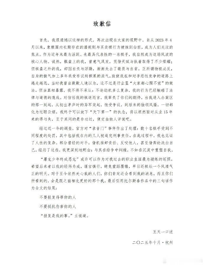 王天一致歉10月21日,象棋大师发布致歉信,信中讲述了其在恶性竞争的道路上越走越