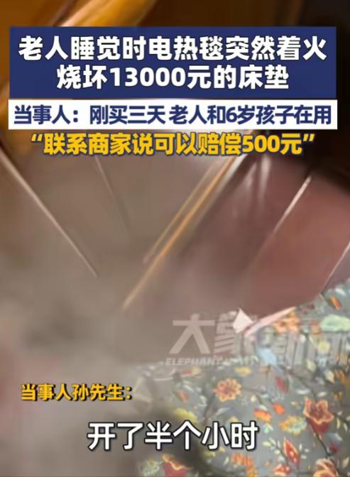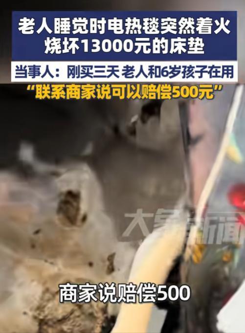 “防不胜防!”10月21日报道,北京,一老人在家睡觉时,新买的电热毯竟突然着火,床上冒出滚滚浓烟,把13000元的床垫烧了一个黑黢黢的大洞,现场一片狼藉,网友:人没伤到就是万幸![紫薇别走] 幸好发现及时,老人和六岁的孩子都平安无事,但看着被烧毁的床铺,一家人心有余悸如果再晚几分钟,如果当时家里没人,后果会怎样,商家最终同意赔偿五百元,但这场虚惊带来的恐惧,远不是金钱能抚平的。 浙江金华,一位八十五岁的老太太没能逃过电热毯引发的火灾,不幸离世,四川达州,一户六口之家因为忘记关闭铺在沙发上的电热毯,醒来时客厅已经化为焦土,损失二十万元。 产品质量,市面上充斥着大量没有认证标志的三无产品,内部电热丝质量低劣,绝缘层偷工减料,通电后极易短路起火,其次是使用方式,很多人习惯整夜开着电热毯睡觉,长时间通电会导致局部过热,加上折叠收纳时电热丝断裂,断口相互接触就会产生火花。 最后是使用年限,国家标准明确规定电热毯安全使用期限为六年,但很多家庭的电热毯用了十几年还在服役,老化的绝缘材料就像一颗定时炸弹。 比电热毯更危险的,是被称作“小太阳”的取暖器,这种设备运行时,表面温度可以达到八百摄氏度,这个温度足以在几秒钟内点燃衣物、窗帘或沙发,很多火灾都是因为出门时忘记关闭,或者为了烘干衣服直接搭在取暖器上导致的。 消防员在处理这类火灾时发现,有些家庭甚至把取暖器放在卧室里彻夜运行,旁边堆着易燃的棉被和衣物,简直是在和死神共眠。 购买时务必认准认证标志和合格证明,多花几十块钱买个品牌产品,总比事后花几万块修房子强。 睡前预热,入睡断电,绝不通宵使用,收纳时要卷起来存放,千万别折叠,更不能压在重物下面,铺的时候上面盖一层薄床单,既能保护电热毯,也能避免温度过高。 电热毯上最好别放热水袋、暖宝宝这些东西,叠加使用容易导致局部温度失控,老人感知温度的能力下降,孩子又容易踢被子,都增加了风险。 电热水袋也是冬季常见的取暖工具,但一定要避开已经被淘汰的电极式热水袋,这种产品摸起来内部有两根硬棍,加热时容易发生爆炸,市面上仍有销售。 充电时人不要离开,更不能边充电边使用,充满后及时拔掉插头,有些人喜欢把热水袋放在被窝里充电,这是非常危险的习惯,一旦漏电或爆裂,后果不堪设想。 暖宝宝虽然温度不高,但长时间贴在同一个部位,同样会造成低温烫伤,尤其是睡觉时,身体保持一个姿势几个小时不动,皮肤持续接受四十多度的热量,醒来后会发现皮肤红肿甚至起泡。 一旦发现取暖设备冒烟或闻到异味,第一时间要做的是切断电源,而不是去查看或试图用手扑灭,电器着火千万不能直接泼水,水会导电造成触电事故,应该先断电再用灭火器或湿棉被覆盖。 网友热评: “我家电热毯从来不过夜,睡前加热半小时就关,宁愿冷点也图个安心!” “真不是危言耸听!我家去年的电热毯半夜冒烟,幸好装了烟雾报警器” “买电热毯一定要看有没有认证,三无产品简直是炸弹”。 “商家赔500元确实气人,但人命比钱重要!” “应该让厂家承担全部损失,才能倒逼质量提升”。 “看着只是冒烟,其实被子里面已烧红,一掀开就爆燃”;年轻父母则关注儿童安全:“再也不敢让孩子单独用电热毯了,改用水暖毯更放心”。 你家电热毯用了多少年?欢迎在评论区分享你的安全使用经验或疑问,一起守护这个冬天的温暖与安全!   信息来源:大象新闻